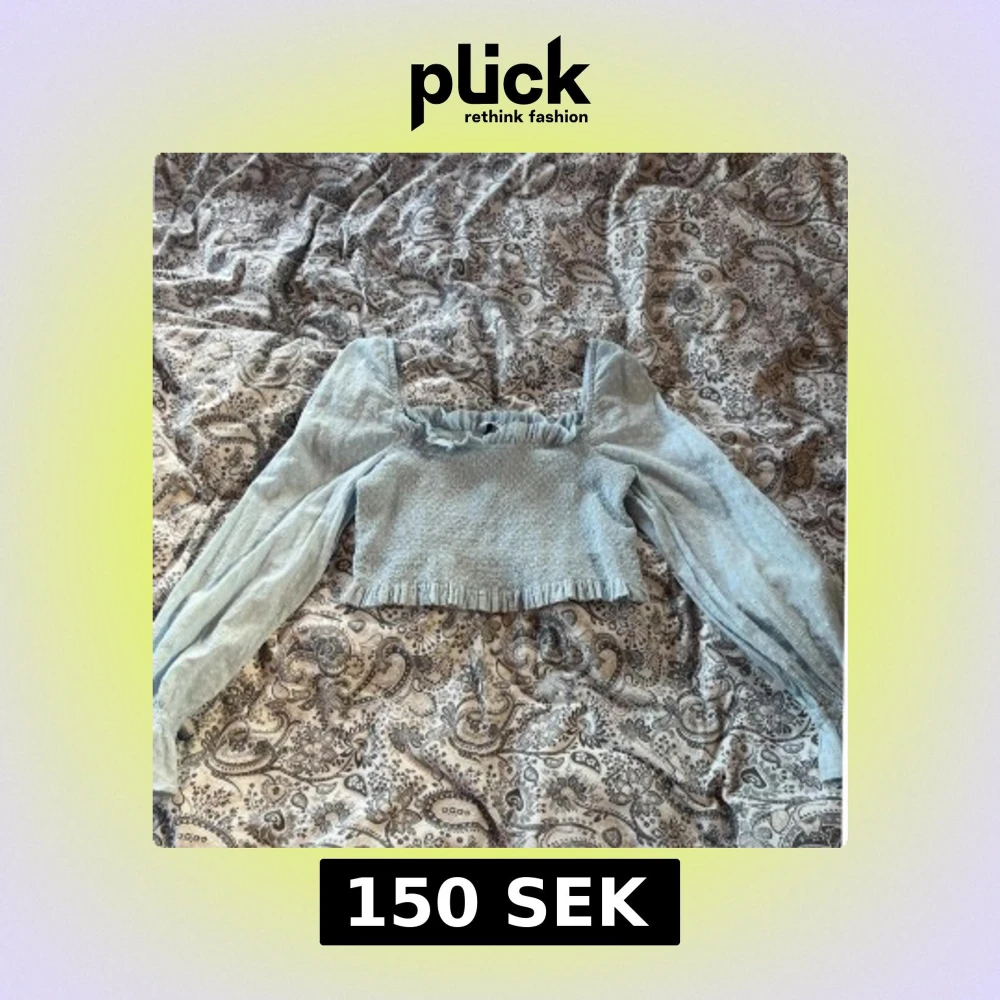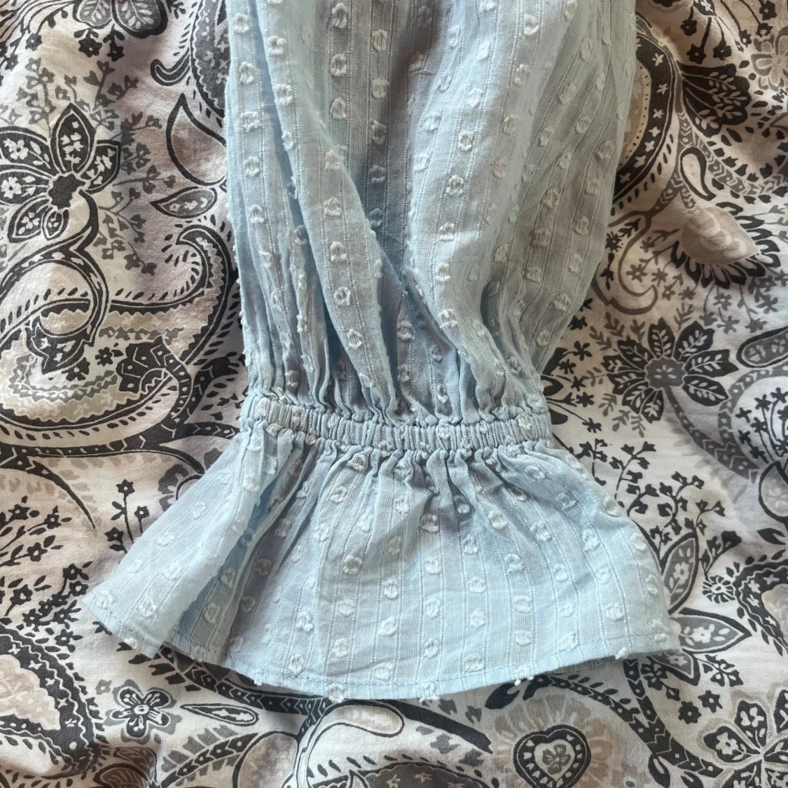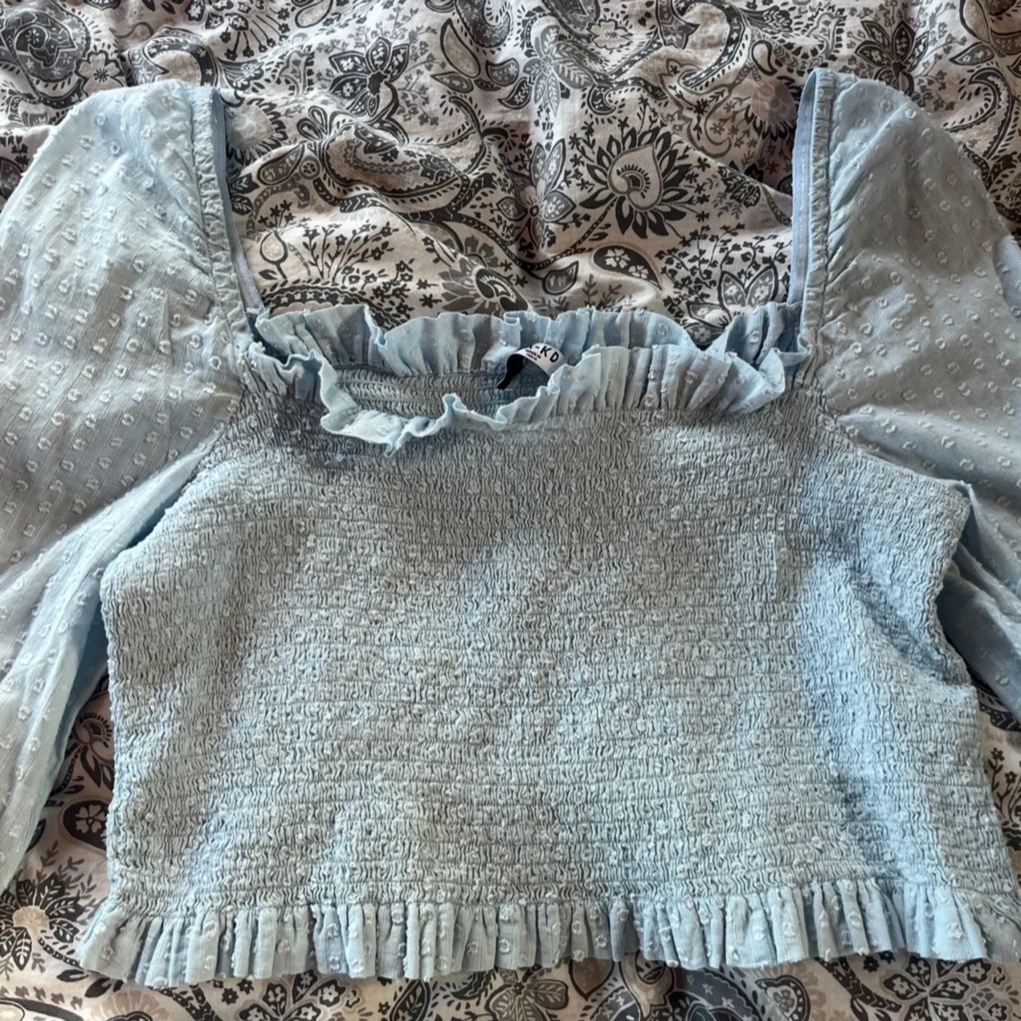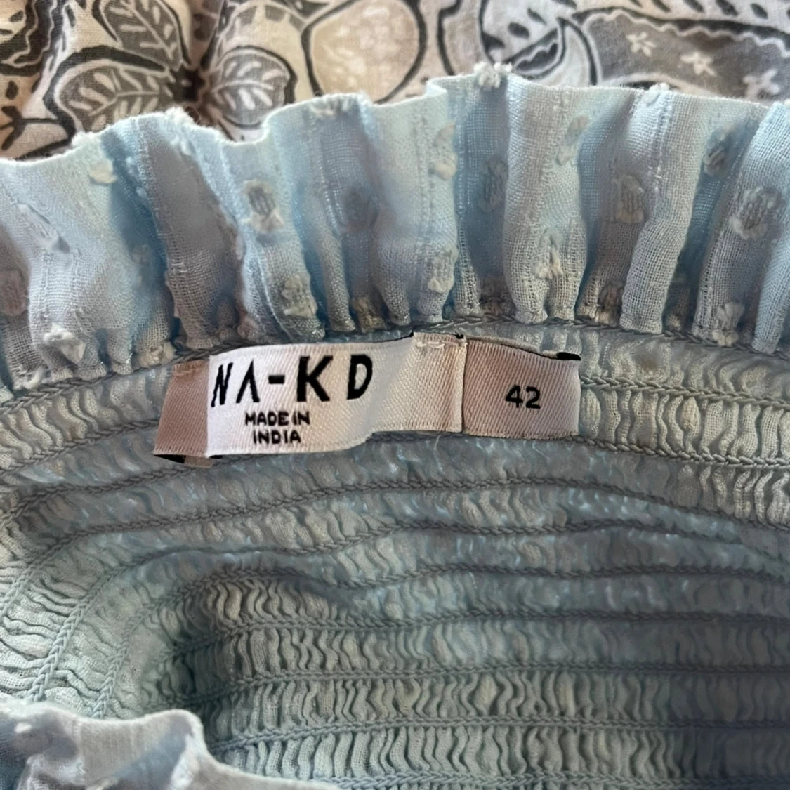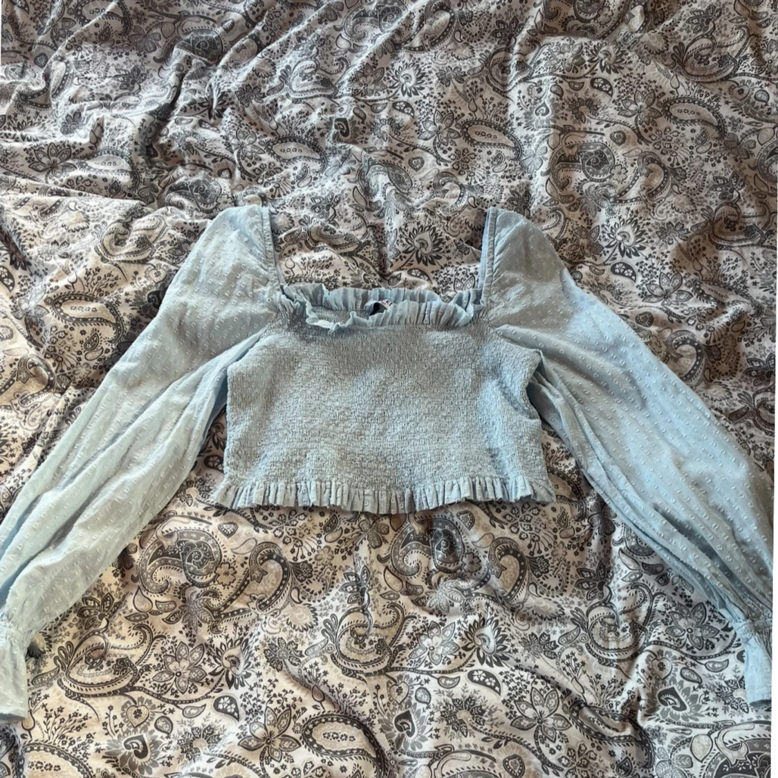Supersöt ljusblå blus från NA-KD med smockad kropp, volangdetaljer vid halsringning och nederkant samt långa puffärmar med diskret prickigt strukturmönster. Blusen har fyrkantig urringning och är croppad för en trendig look.Använd några gånger men har inga märken!Säljer för den är lite liten på mig och lite kort för min smak