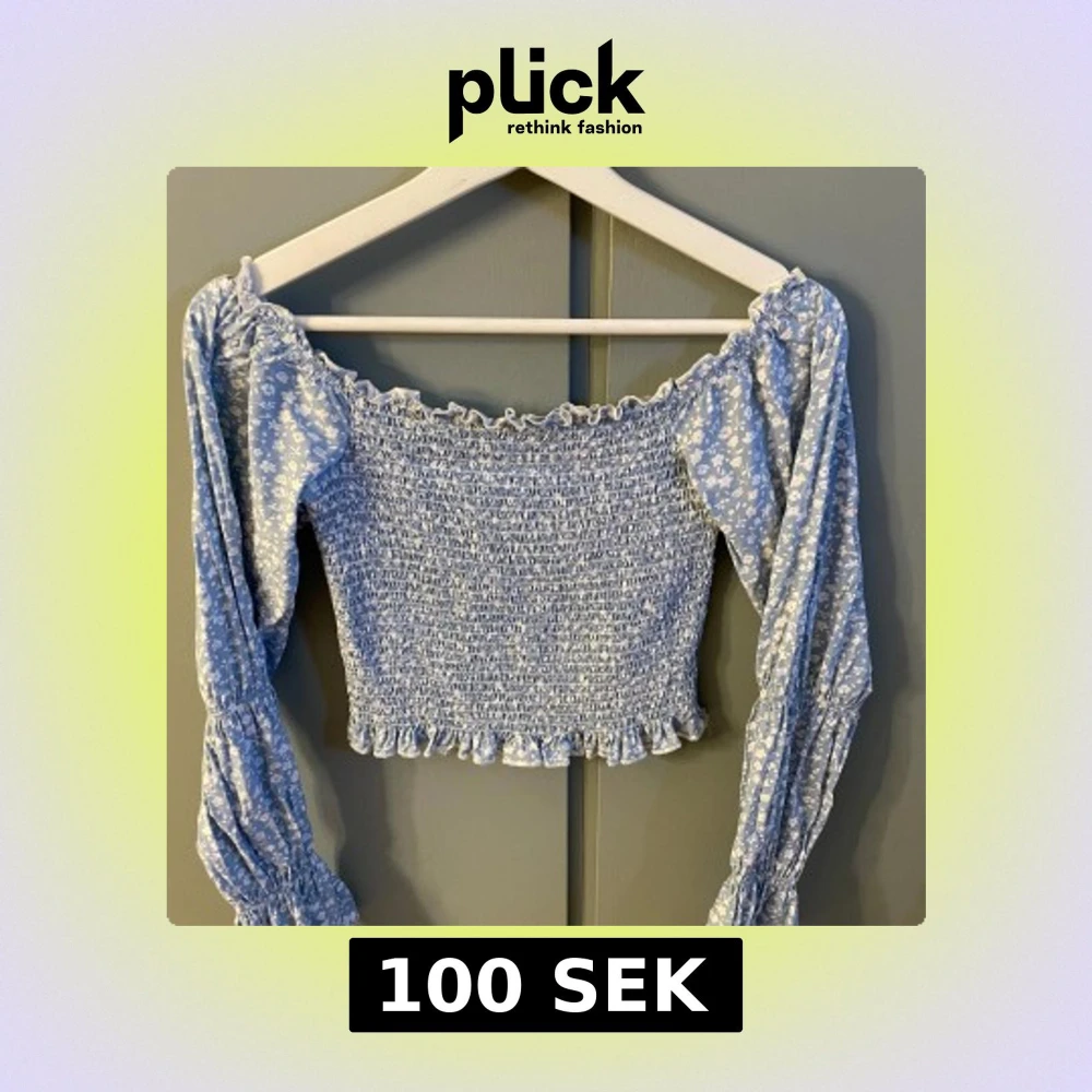 Supersöt ljusblå croppad blus från NA-KD med små vita blommor, smockad överdel och volangdetaljer vid halsringning och nederkant. Långa puffärmar med resår vid handlederna ger en romantisk känsla.