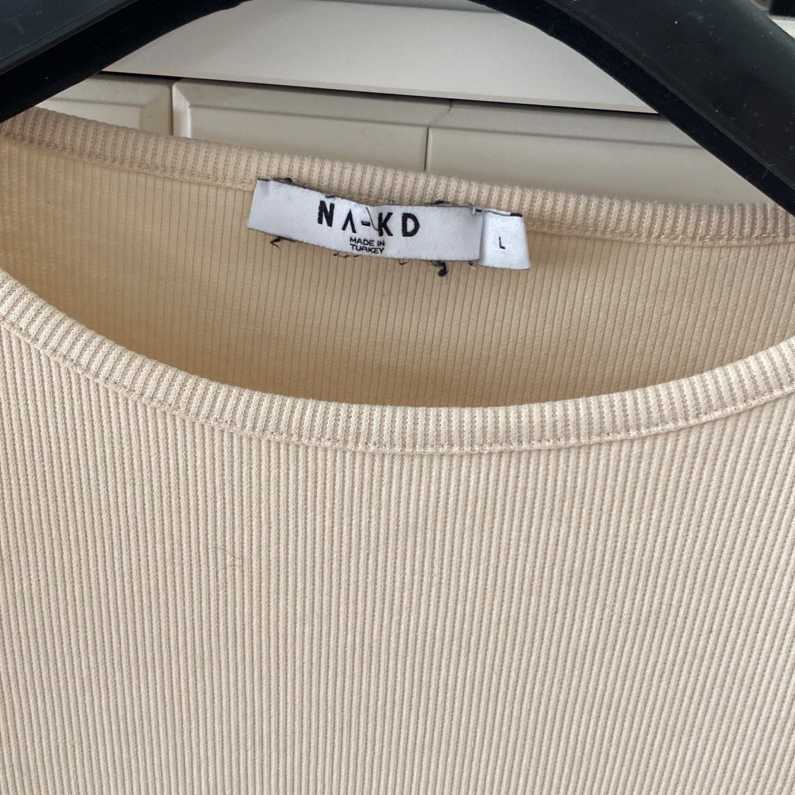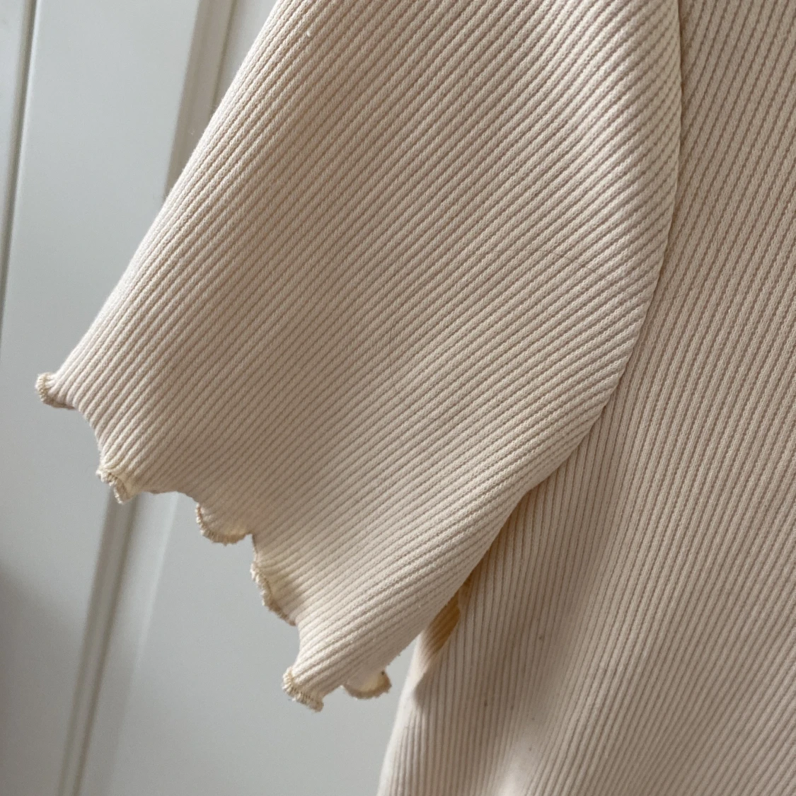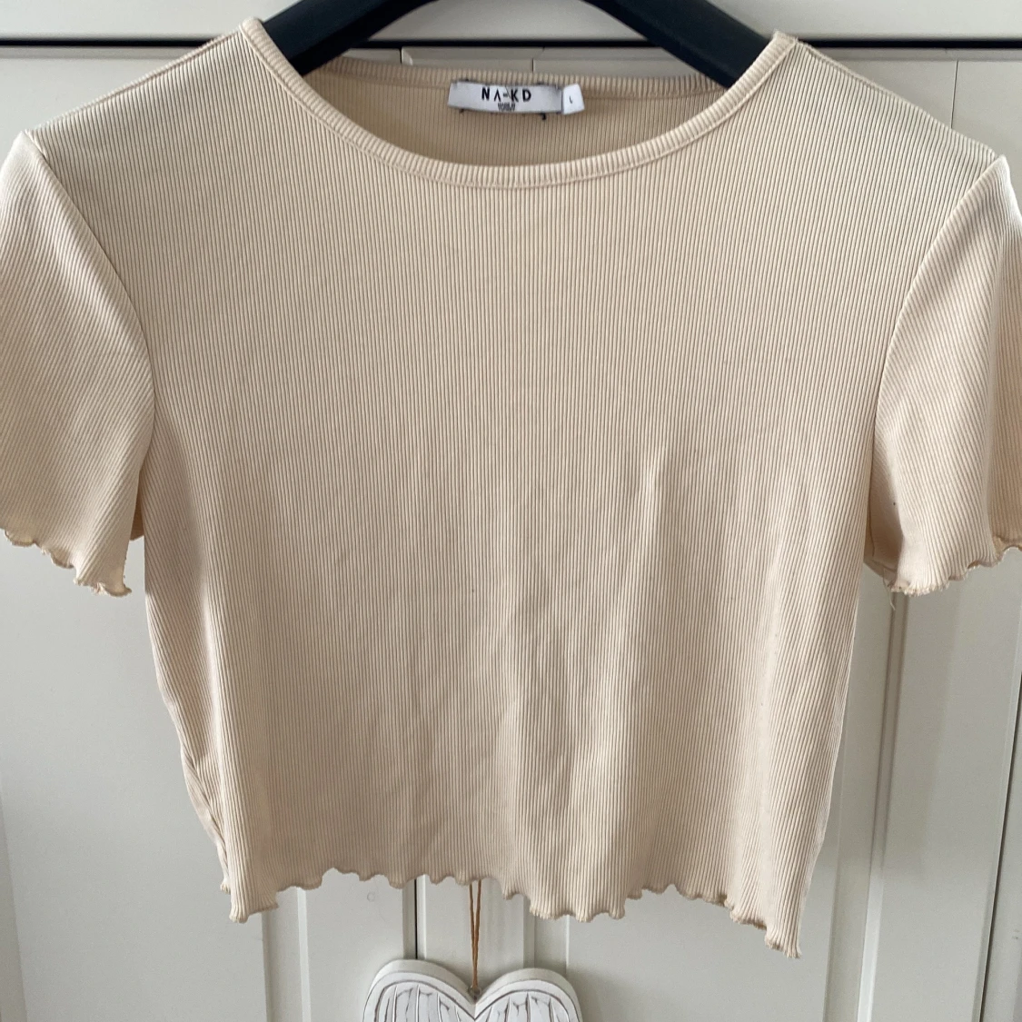 Säljer en beige croppad topp från NA-KD med ribbad struktur. Toppen har korta ärmar och vågig kant nertill för en trendig look. Perfekt att matcha med jeans eller kjol. Se mina annonser! Jag kan samfrakta!