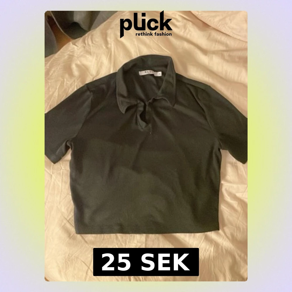 Säljer en svart croppad polotopp från NA-KD i storlek M. Toppen har korta ärmar, krage och är tillverkad i ett ribbat material som ger en snygg struktur. Perfekt för dig som gillar stilrena och trendiga plagg.