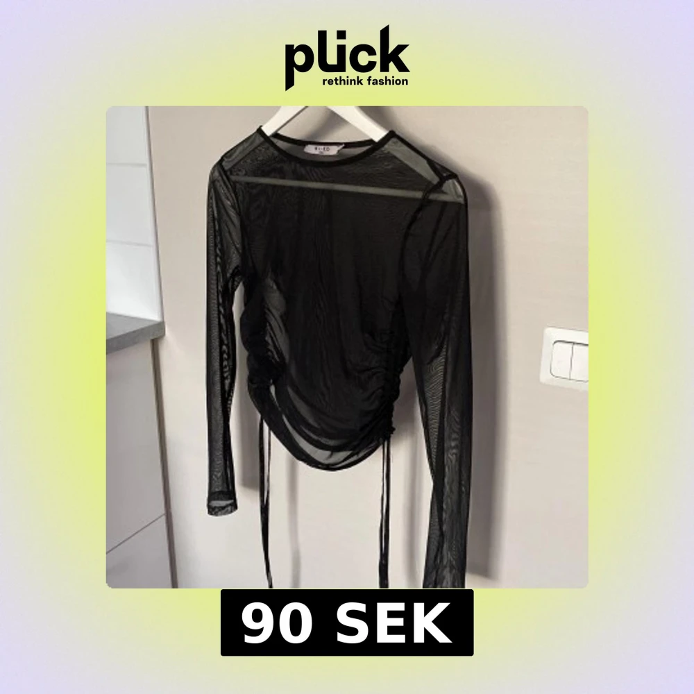Säljer en svart mesh topp från NA-KD i storlek S. Toppen är långärmad, transparent och har snygga snörningsdetaljer på sidorna som ger en cool, rynkad effekt. Perfekt för att styla lager på lager eller med ett linne under.