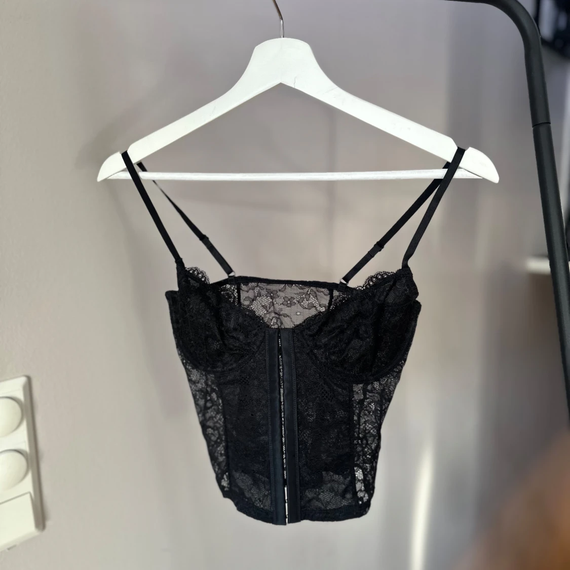 Snygg svart spetskorsett med smala axelband. Perfekt för en utekväll eller fest. Passar bra under en kavaj. Nyskick, endast provad! Nypris 349kr