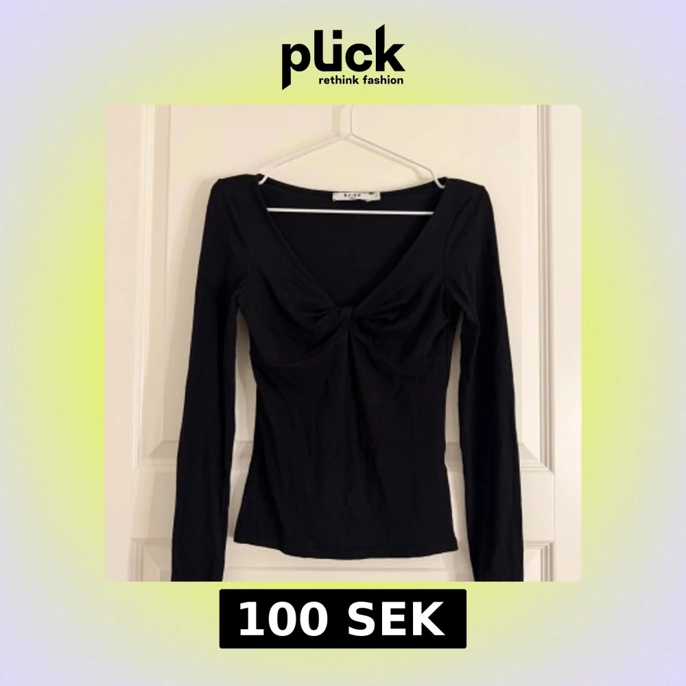 Trendig svart långärmad topp från NA-KD med djup v-ringning och twistad detalj framtill. Figurnära passform och mjukt stretchigt material som sitter snyggt på kroppen. Användt den några gånger