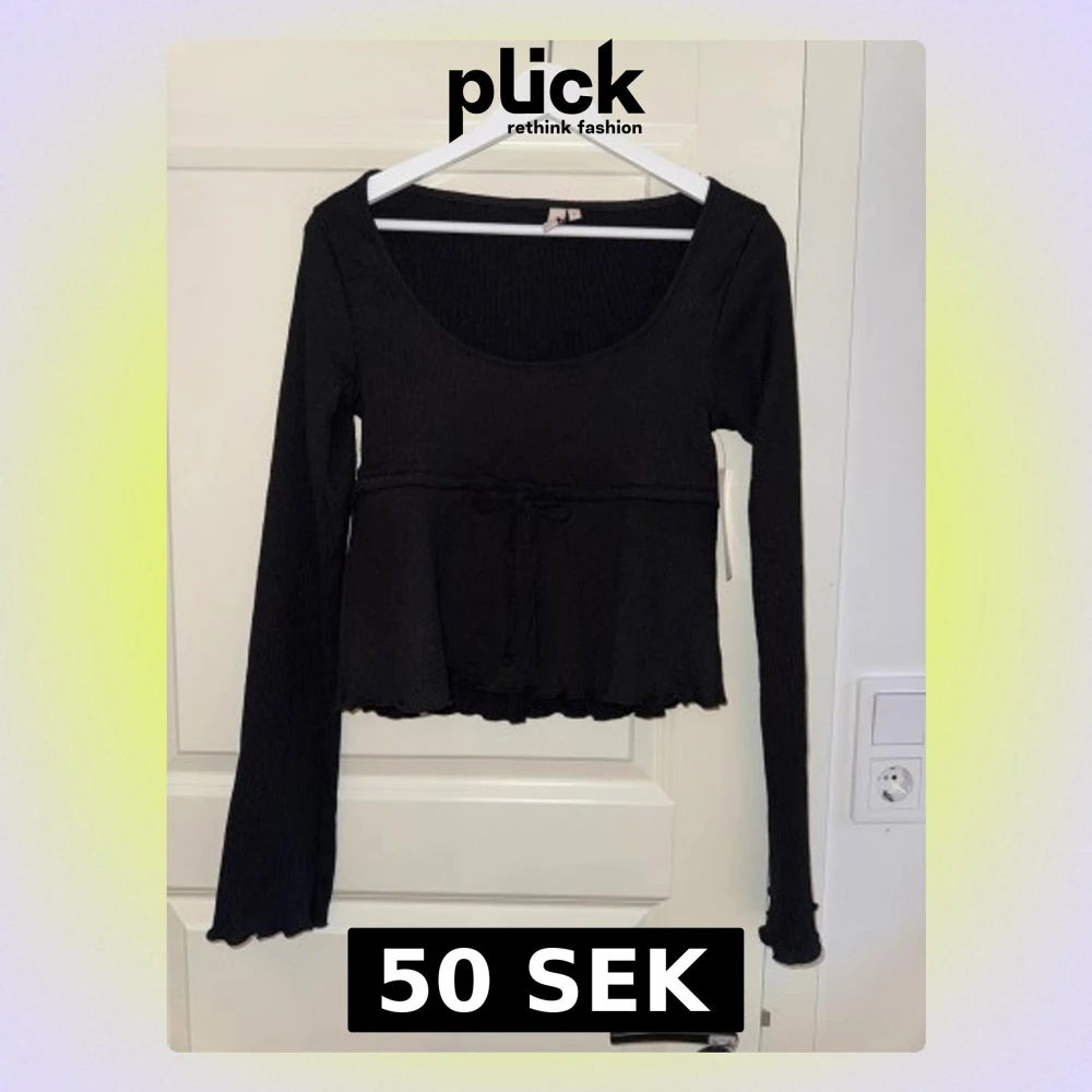 Svart långärmad topp från Nelly med ribbad struktur och söt knytning under bysten. Modellen har en rundad, djup urringning och volangkant vid ärmslut och nederkant. Perfekt att styla med jeans eller kjol för en chill look.