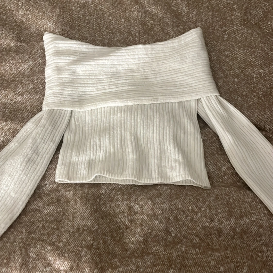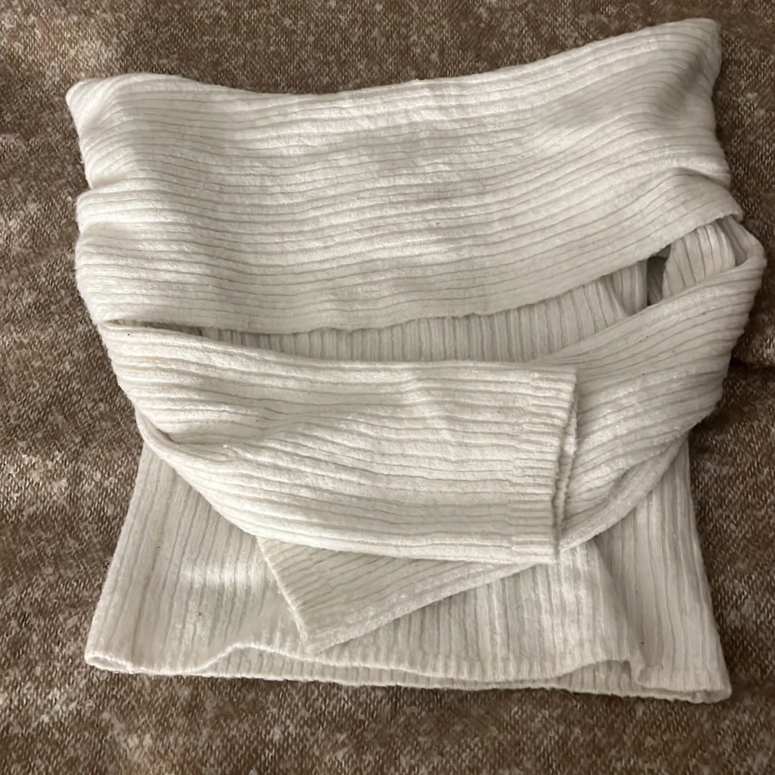 Superfin vit ribbad topp från NA-KD med offshoulder-design och långa ärmar. Materialet är mjukt och stretchigt, vilket gör den bekväm att bära. Den har en croppad passform och bred kant upptill som ger en snygg siluett.