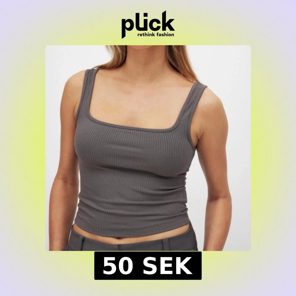 Snygg grå ribbad linnetopp med breda axelband och fyrkantig halsringning. Perfekt för en stilren och enkel look.