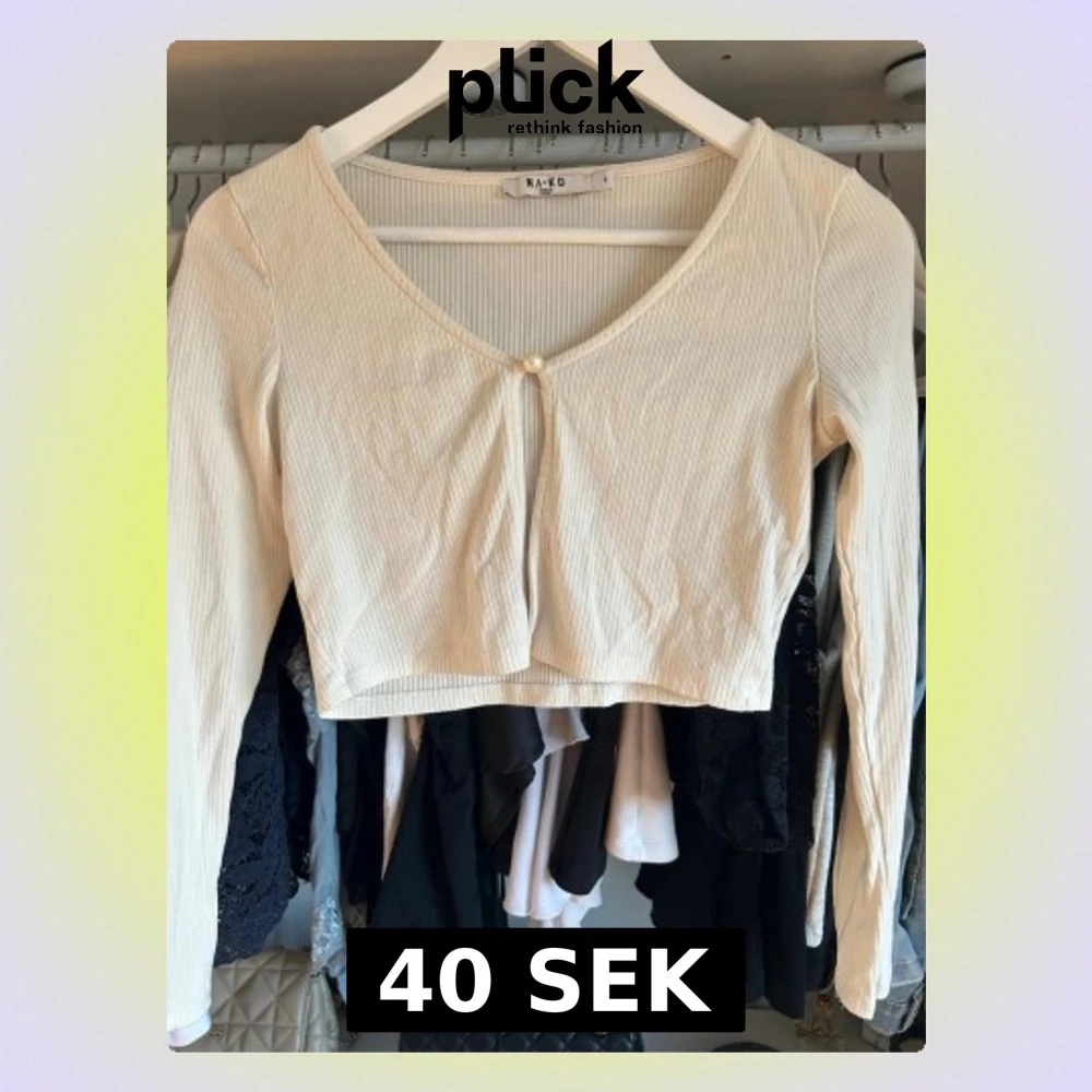 Trendig ljusbeige ribbad croppad topp från NA-KD med lång ärm och v-ringning. Toppen har en liten pärldetalj framtill och är tillverkad i mjukt material som sitter snyggt på kroppen. Perfekt för att styla med höga jeans eller kjol.