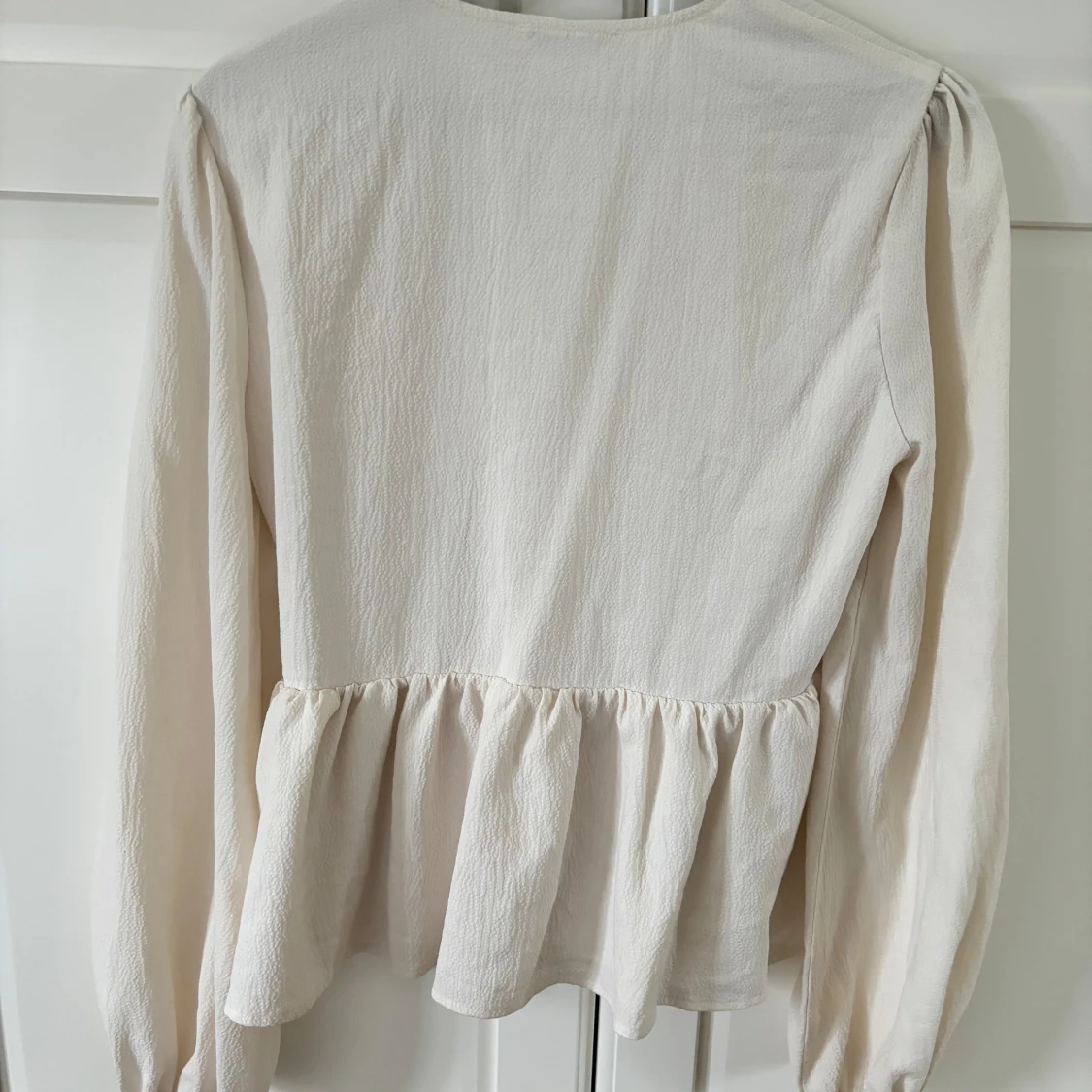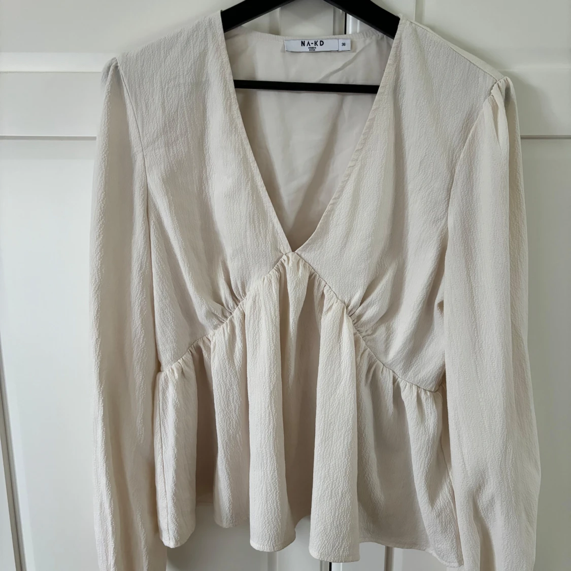 Säljer en superfin beige blus från NA-KD i mycket bra skick. Den har en v-ringad design och långa ärmar med en lätt volangdetalj i midjan. Perfekt för både vardag och festliga tillfällen. Passar bra till både jeans och kjol!