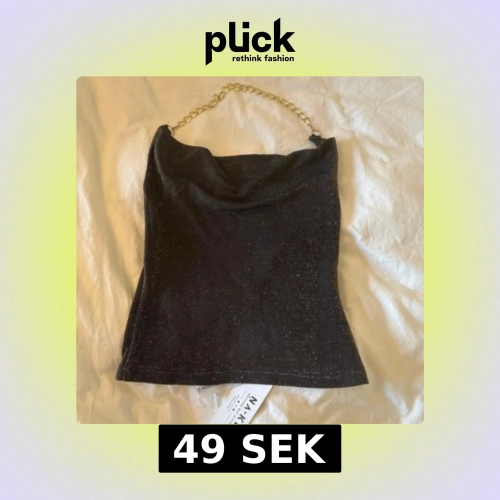 Supersnygg svart tubtopp från NA-KD med glittrigt tyg och en chunky guldfärgad kedja som axelband. Toppen har en cool draperad halsringning och är croppad i modellen. Perfekt för att sticka ut med lite extra bling på festen!