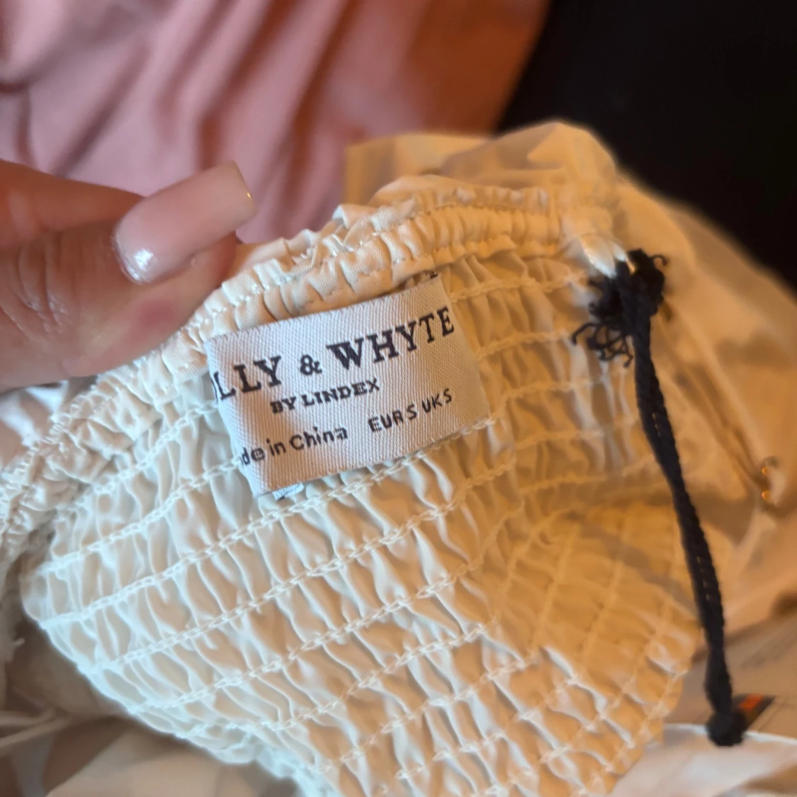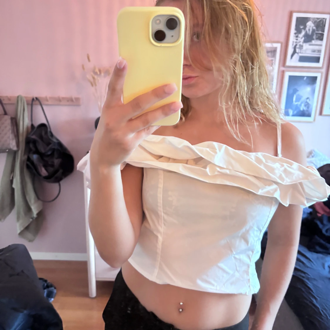 Superfin vit offshoulder topp från holy and White. . Toppen är croppad och har en bred volang längs överkanten som ger en snygg statement-look. Perfekt för dig som vill sticka ut lite extra i sommar. Den har band som även går att ta av som du ser på bilderna. Helt oanvänd med prislappar på.