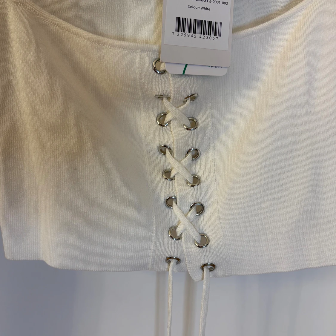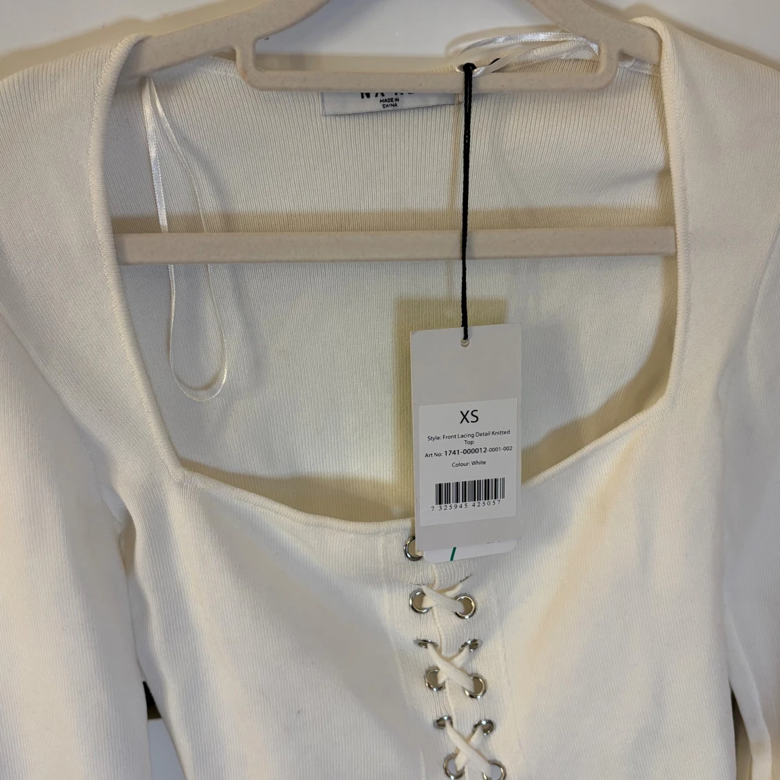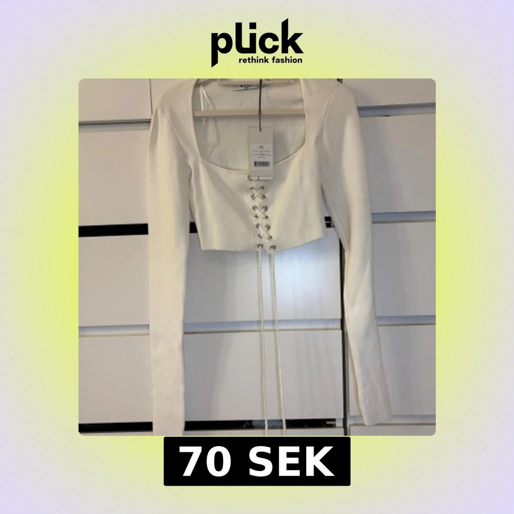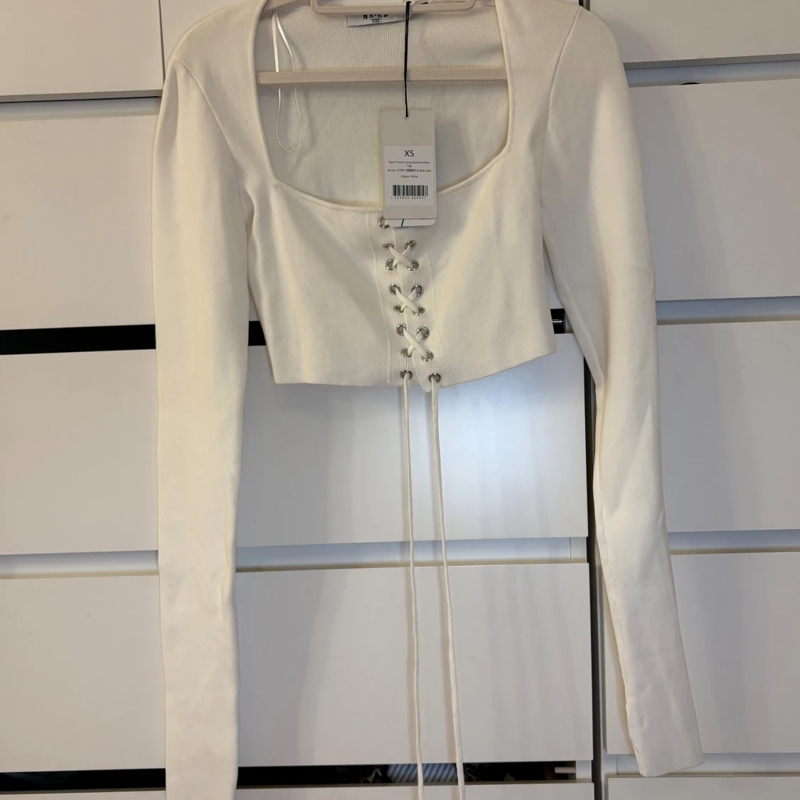 Säljer en vit croppad topp från NA-KD med långa ärmar och snygg snörning framtill. Toppen har fyrkantig urringning.