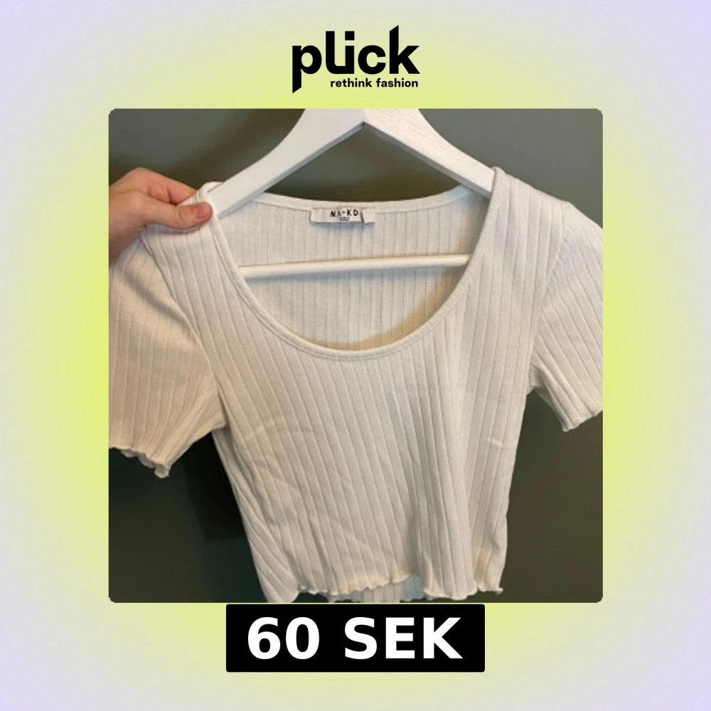 Superfin vit topp från NA-KD i ribbad bomullsmix. T-shirten har korta ärmar, rund halsringning och vågig kant nertill. Perfekt till jeans eller kjol för en clean och fräsch look.