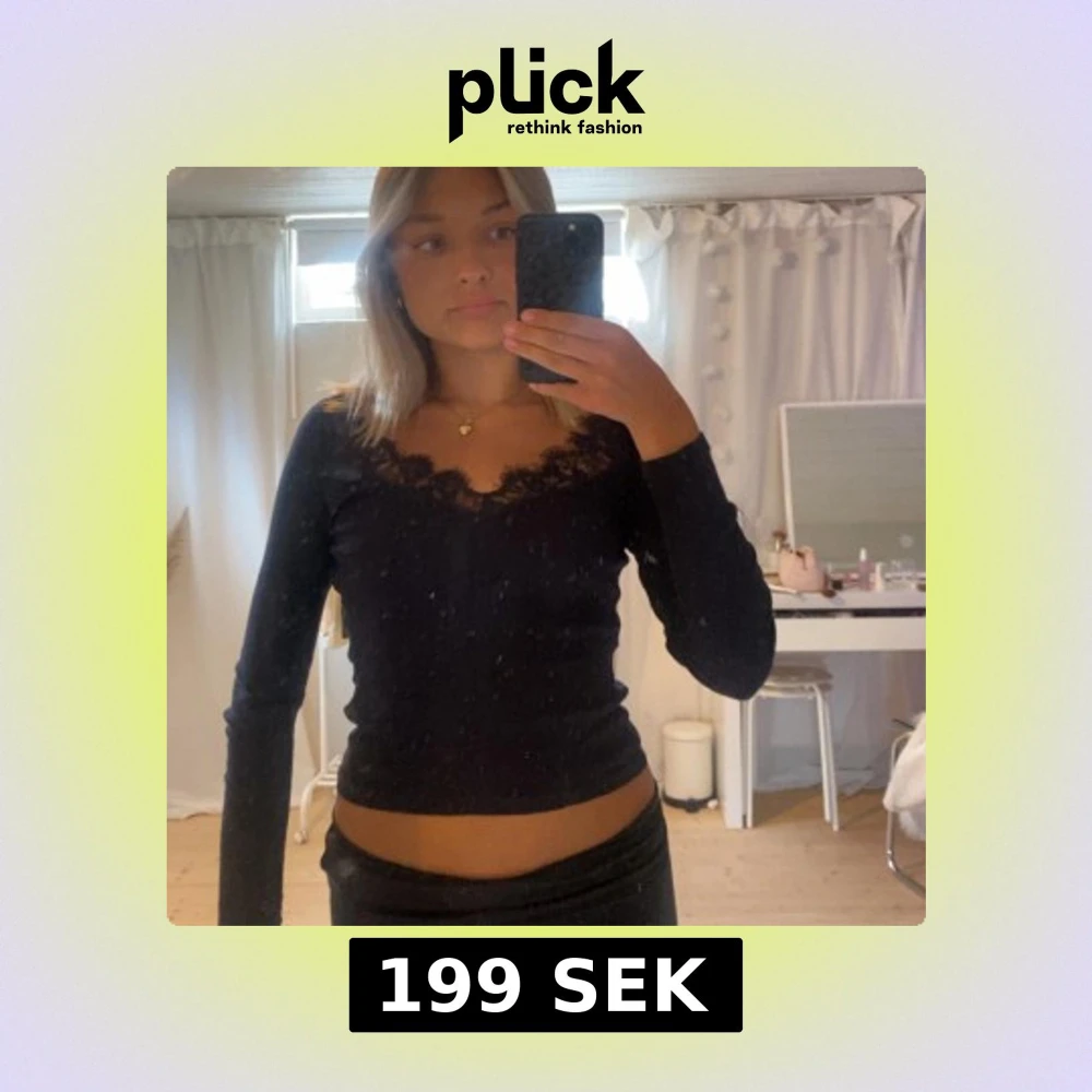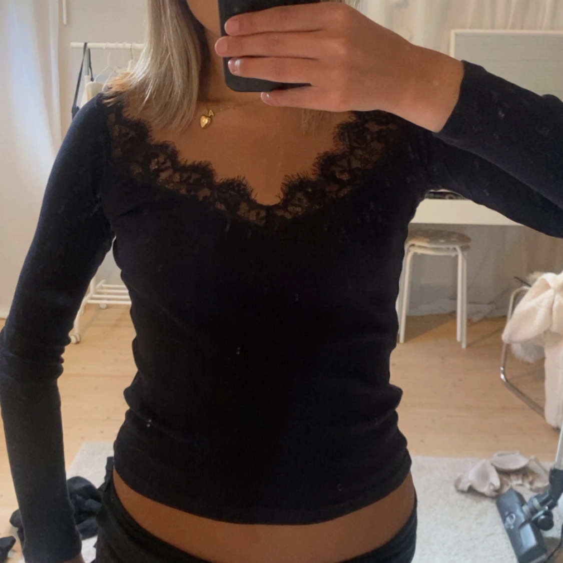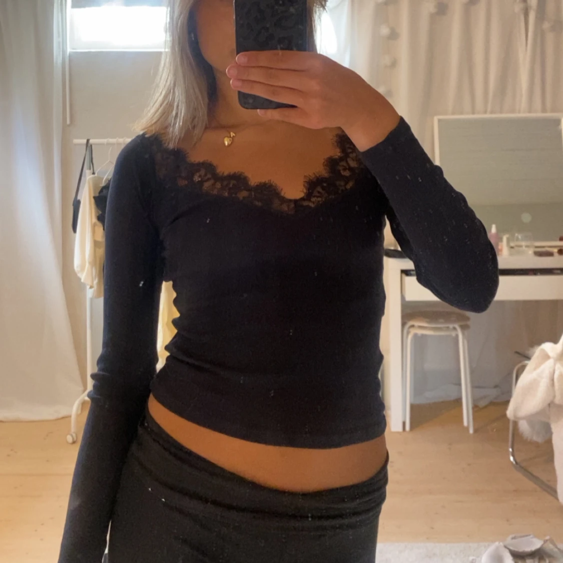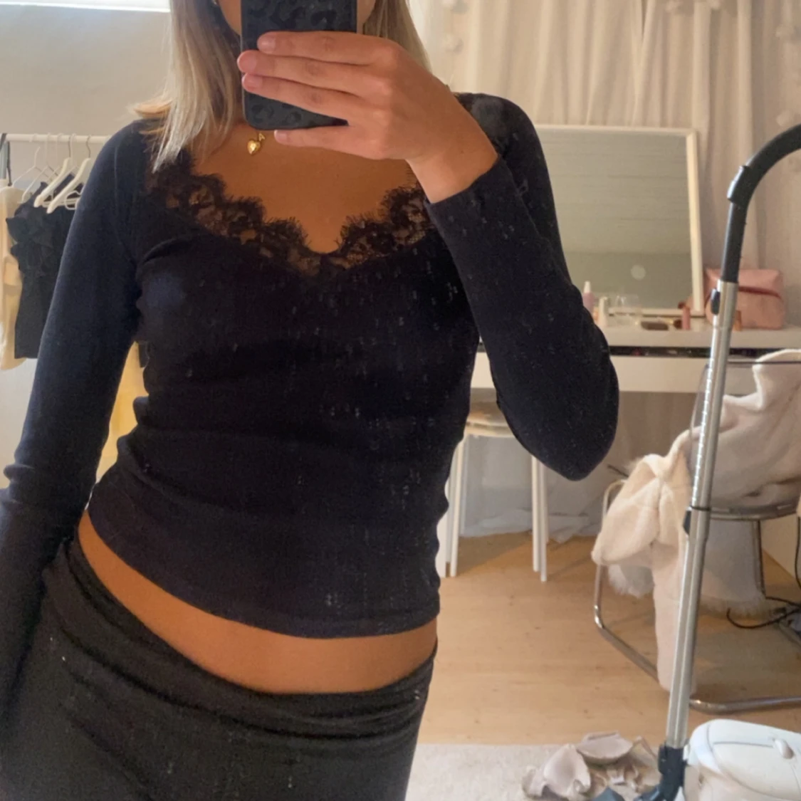 Svart långärmad topp med snygg v-ringning och spetsdetaljer längs halsringningen. Modellen är figurnära och croppad, vilket ger en trendig look. Perfekt att styla med jeans eller kjol för en cool vibe.