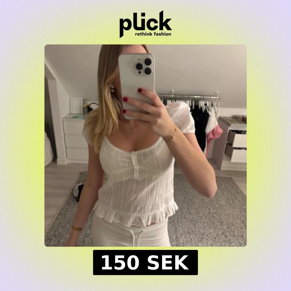 Supersöt vit blus med tunna vertikala ränder, puffärmar och volangkant nertill. Blusen har knappar framtill och en smickrande v-ringning. Materialet känns lätt och luftigt, perfekt för varmare dagar.