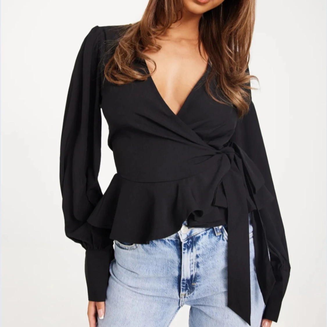 Snygg svart omlottblus med v-ringning och långa ärmar. Blusen har ett brett knytband i midjan och volangdetalj nedtill. Perfekt att styla med jeans eller kjol.