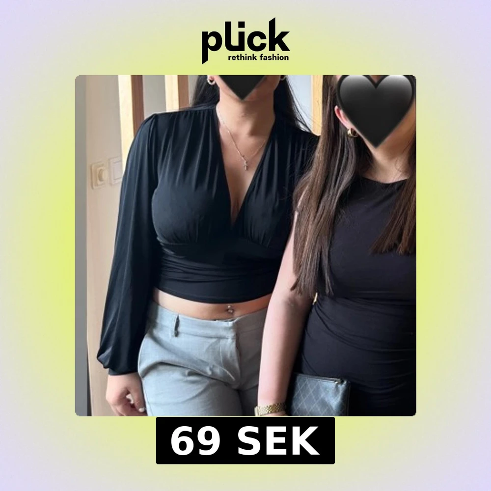 Säljer en svart omlottopp med lång ärm och djup v-ringning. Toppen har rynkade detaljer i sidorna och är tillverkad i ett mjukt, stretchigt syntetmaterial. Perfekt att styla med både jeans och kostymbyxor.