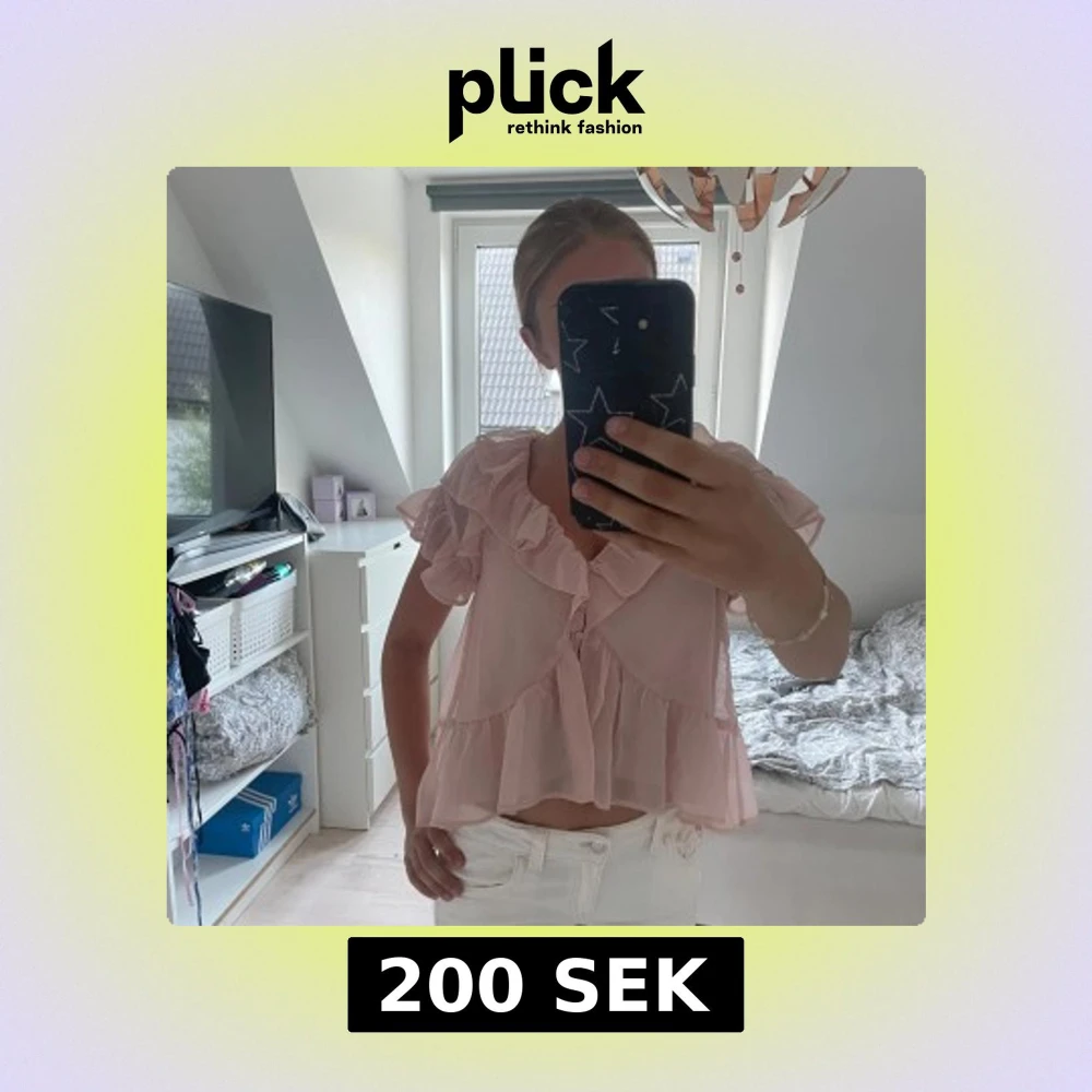Supersöt ljusrosa blus från Nelly med volanger längs halsringningen, ärmarna och nederkanten. Knappast använd och i nyskick💘💘