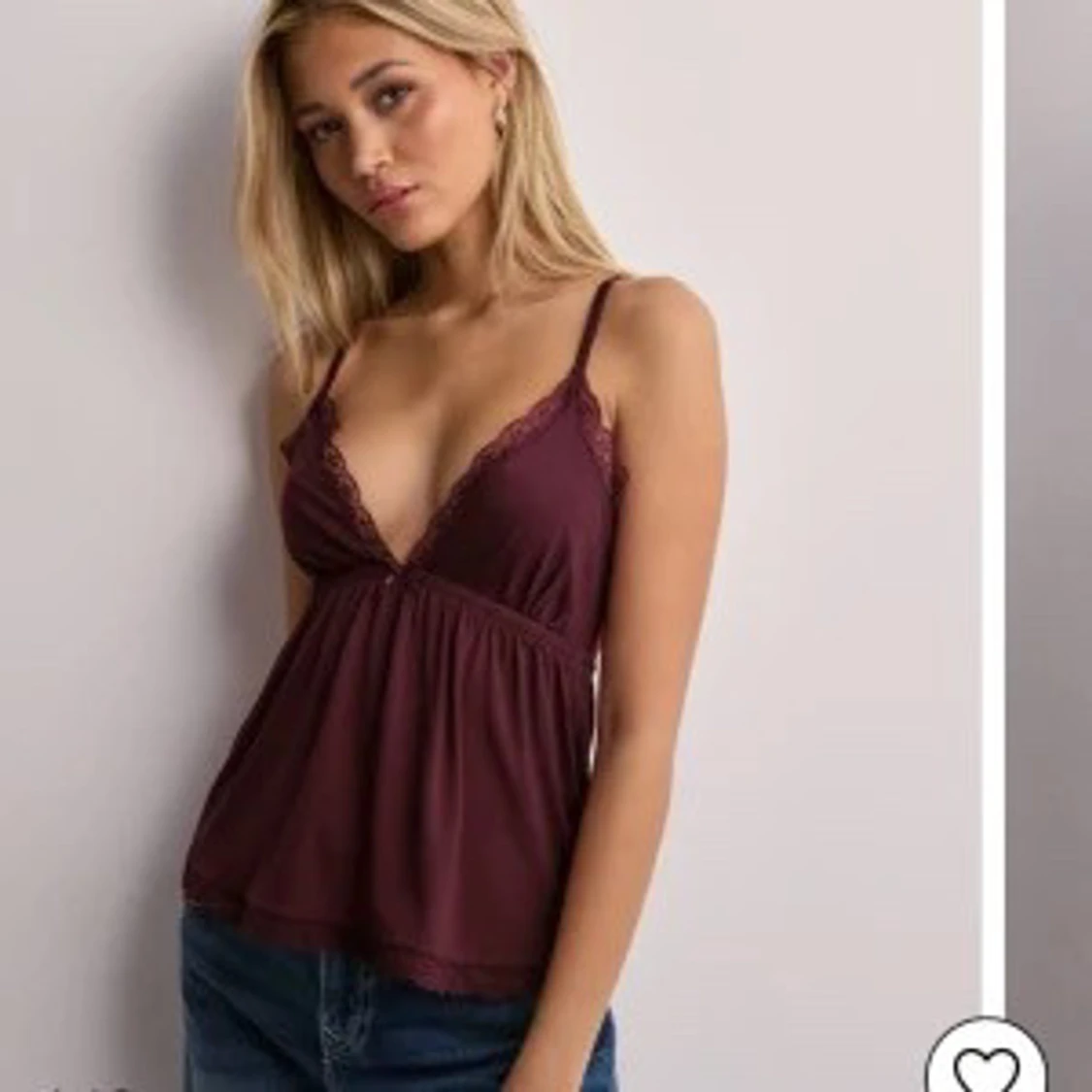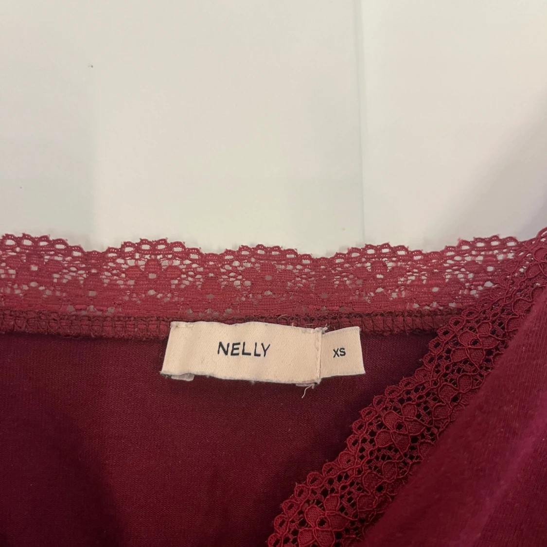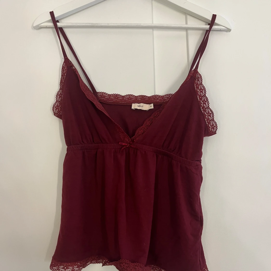 Säljer en vinröd linnetopp från Nelly med tunna axelband och fina spetsdetaljer längs kanterna. Toppen har omlott-skärning och liten rosett framtill. Perfekt för sommaren eller som ett lagerplagg.