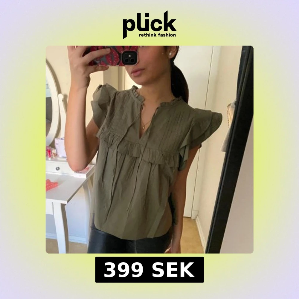 Säljer en olivgrön blus med volangdetaljer och korta ärmar. Blusen har en lätt v-ringning med liten krage och dekorativa sömmar framtill. Perfekt att styla med jeans eller kjol.