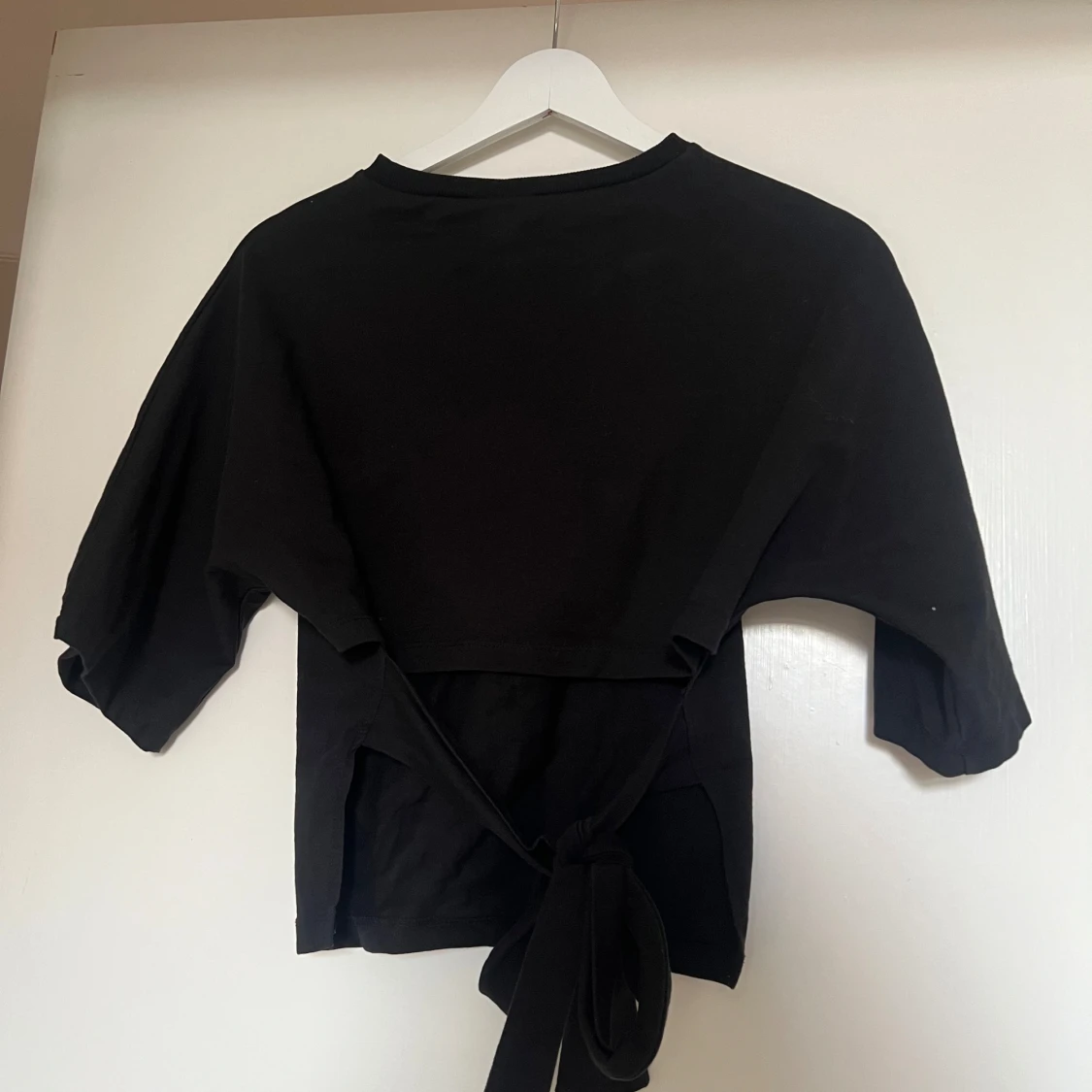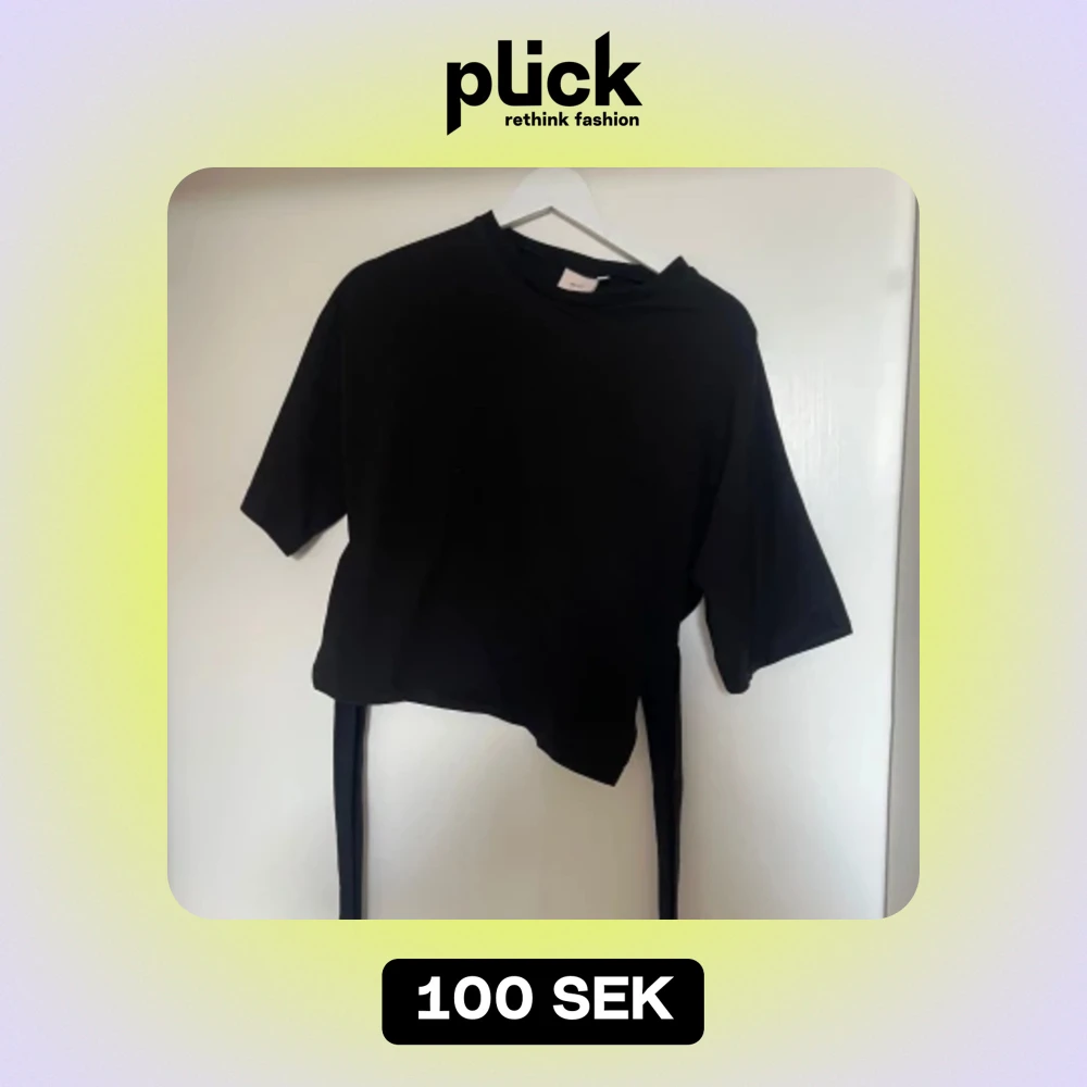 Har använt tröjan ett par gånger men använder den inte längre så säljer den, man knyter den bak på ryggen lite längre ner och framifrån så ser det ut som en t-shirt men att den går in lite vid midjan ungefär💕