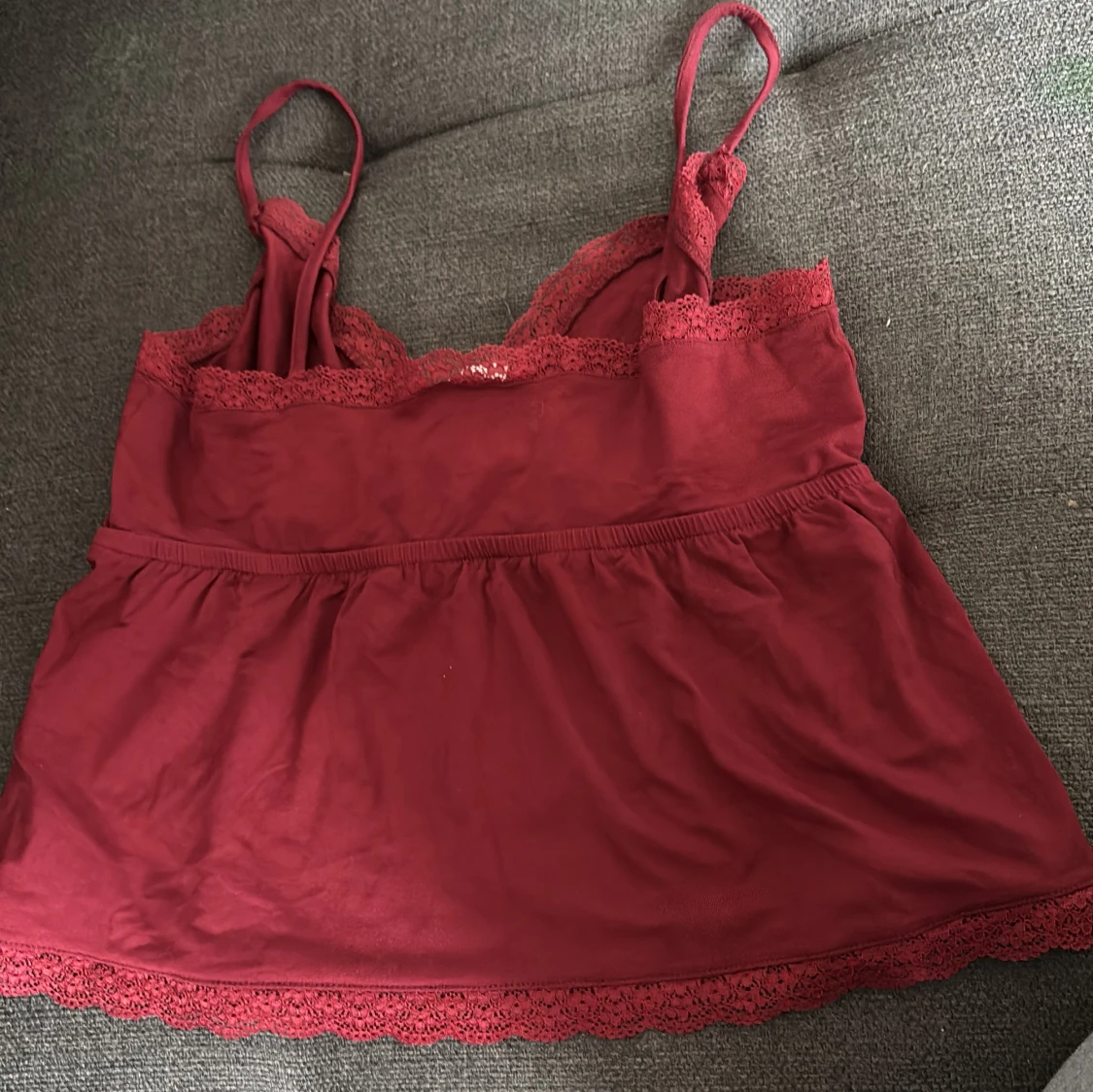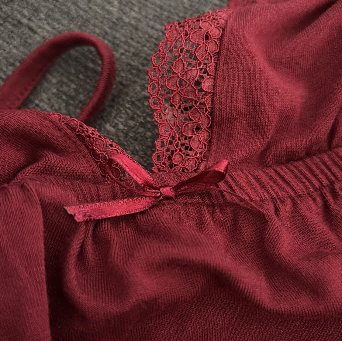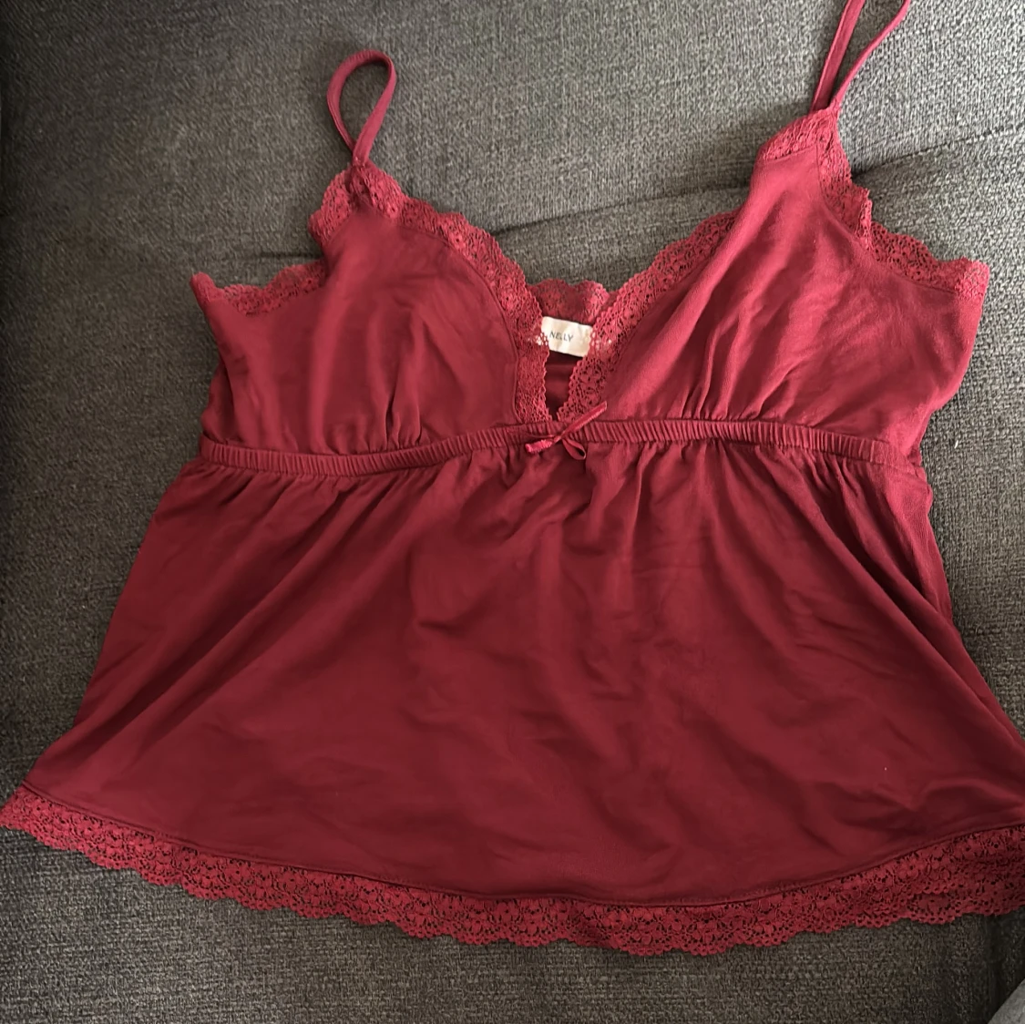 Supersöt vinröd linnetopp från Nelly med tunna axelband och v-ringad hals. Toppen har spetsdetaljer längs halsringning och nederkant samt en liten rosett framtill. Mjuk och skön bomullskänsla, perfekt för dig som gillar romantiska vibes.Har inte använt då sen va för stor.Ordinarie pris 250kr.