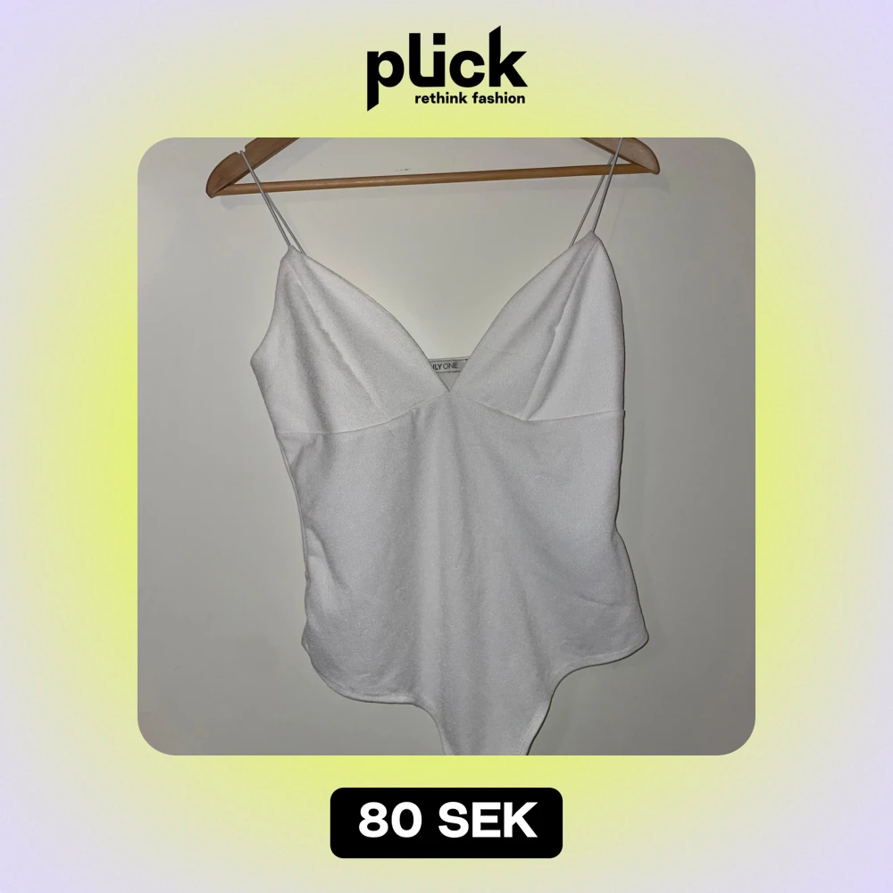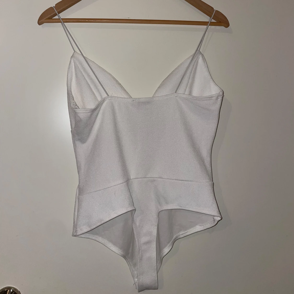 Säljer en stilren vit bodysuit med smala axelband och v-ringning. Perfekt för sommardagar eller som basplagg under en kavaj. Materialet är mjukt och stretchigt för en bekväm passform. Passar både till vardags och fest!