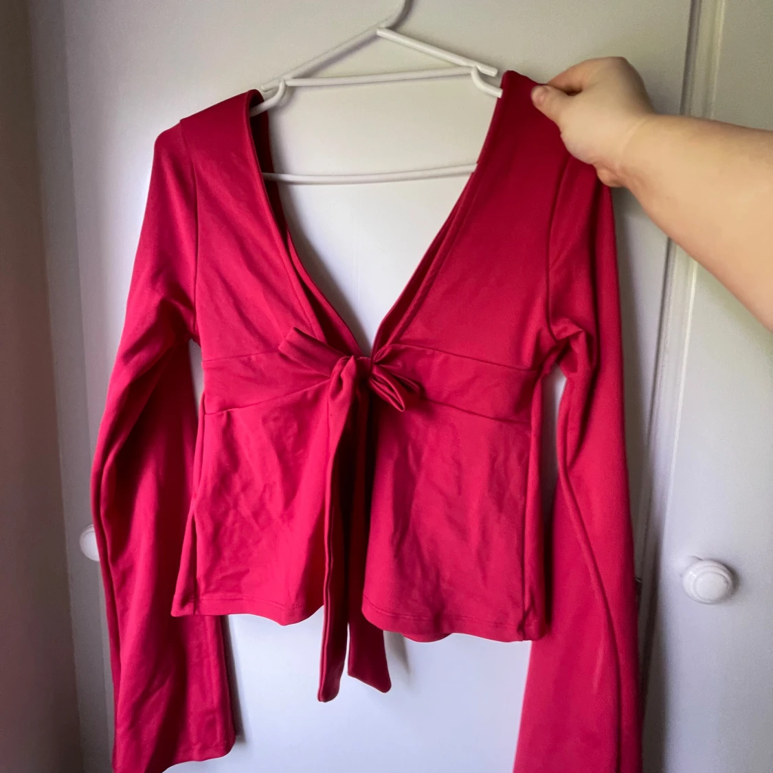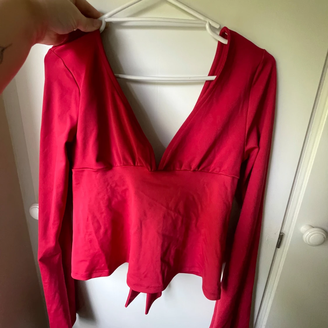 Säljer en snygg röd omlottopp från Nelly i storlek M. Toppen har långa ärmar, djup v-ringning och knyt framtill som ger en trendig look. Tillverkad i mjukt material som känns skönt mot huden. Perfekt för dig som vill sticka ut lite extra.