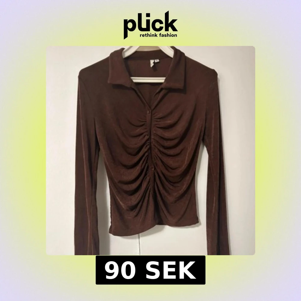 Snygg brun rynkad topp med knappar och med långa ärmar och krage. Framtill har den en cool rynkdetalj som ger en unik look. Perfekt för dig som gillar trendiga och bekväma plagg med lite extra attityd. Storlek M.