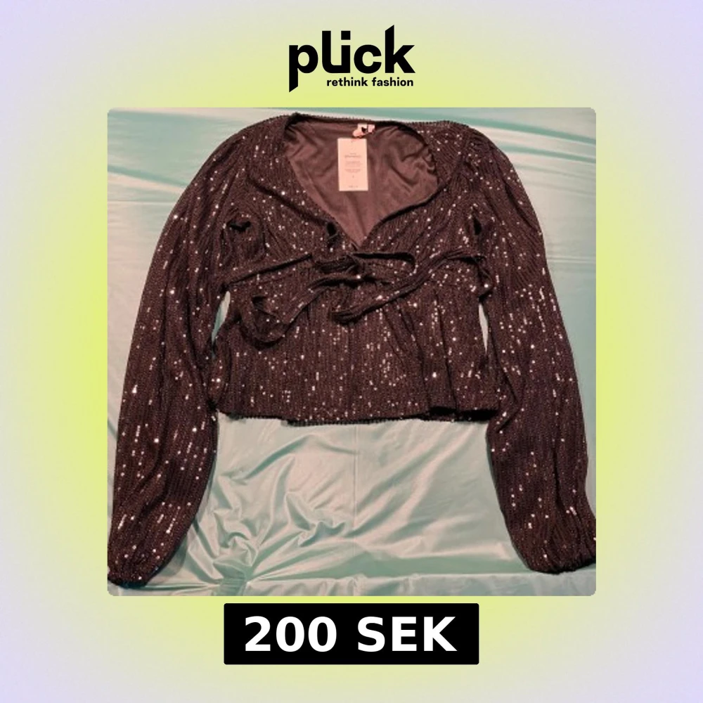 Säljer en svart omlottopp från Nelly med glittriga paljetter över hela tyget. Helt oanvänd med lappen kvar!