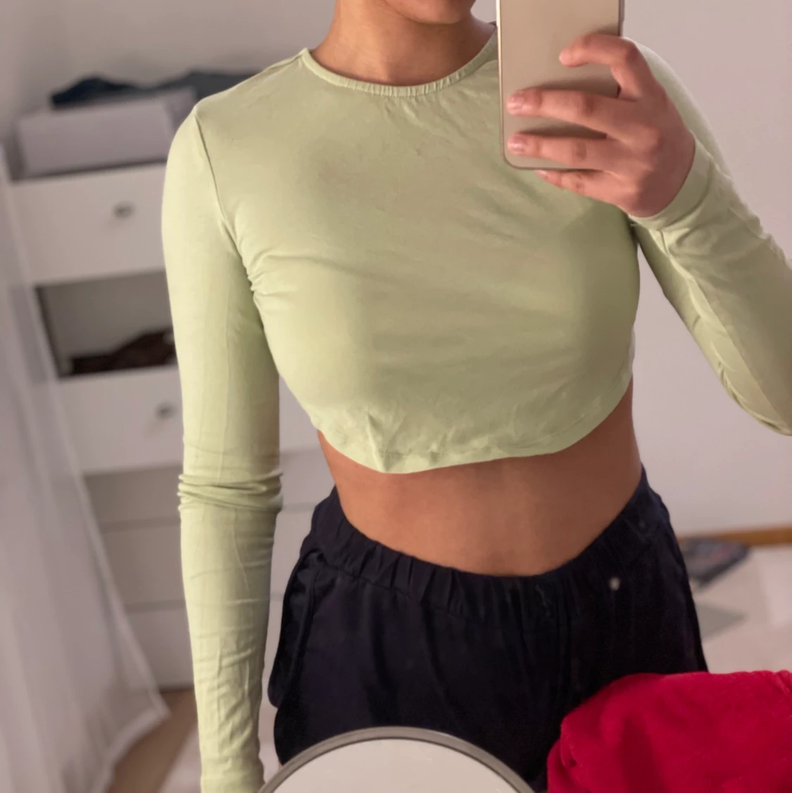 Croppad grön tröja som är väldigt låg i ryggen. Använd 1 gång. Från Nelly. Frakt medkommer