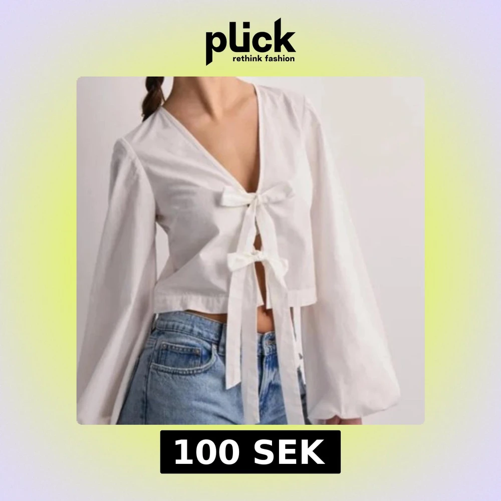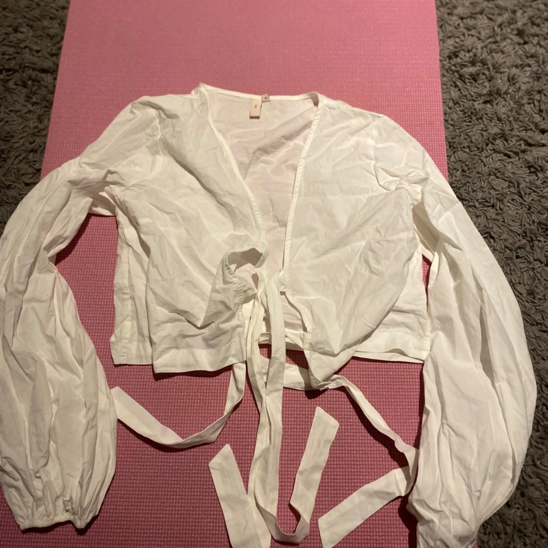 Säljer en vit omlottopp med långa puffärmar och två knytband framtill. Toppen har v-ringning och croppad passform, perfekt att styla med jeans eller kjol. Tillverkad i lätt bomullstyg för en luftig känsla. Lite använd. ORDPRIS: ca 400kr