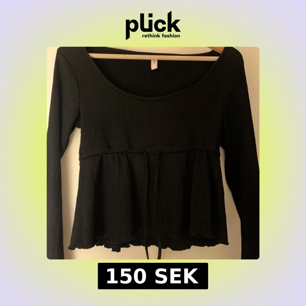 Säljer en svart långärmad blus från Nelly med rundad halsringning och smockad struktur. Toppen har en volangkant nertill och knytband i midjan för en snygg passform. Perfekt att styla med jeans eller kjol.