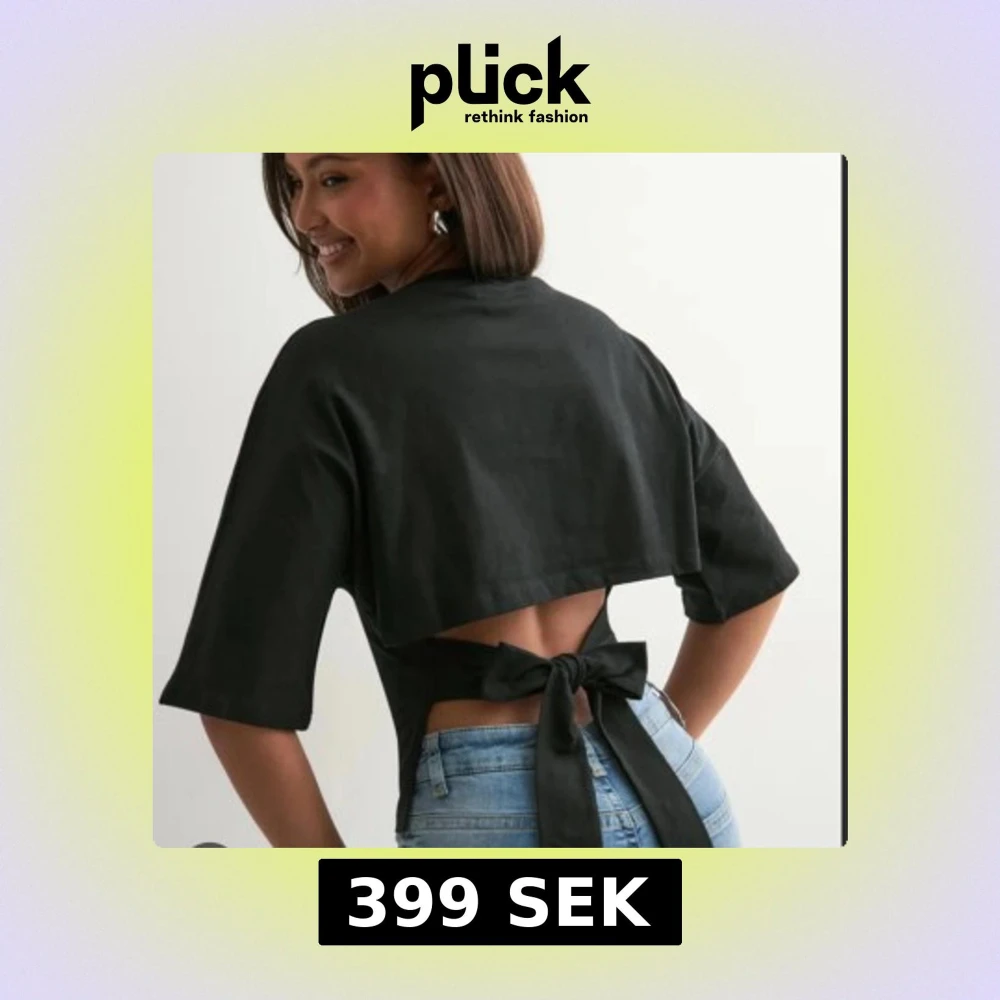Svart croppad topp med halvlånga ärmar och öppen rygg som knyts med en stor rosett baktill. Snygg och trendig design som passar perfekt till jeans eller kjol. Toppens material ser ut att vara bomull eller polyester.