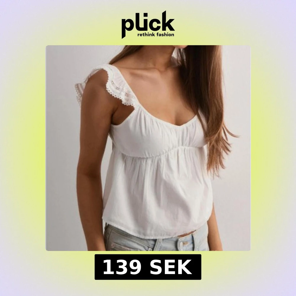 Supersöt vit blus i bomull med volangprydda axelband och v-ringning. Toppen har en luftig passform och knytning i ryggen som ger en extra detalj. Perfekt för varma dagar och ger en romantisk vibe till din outfit.💘