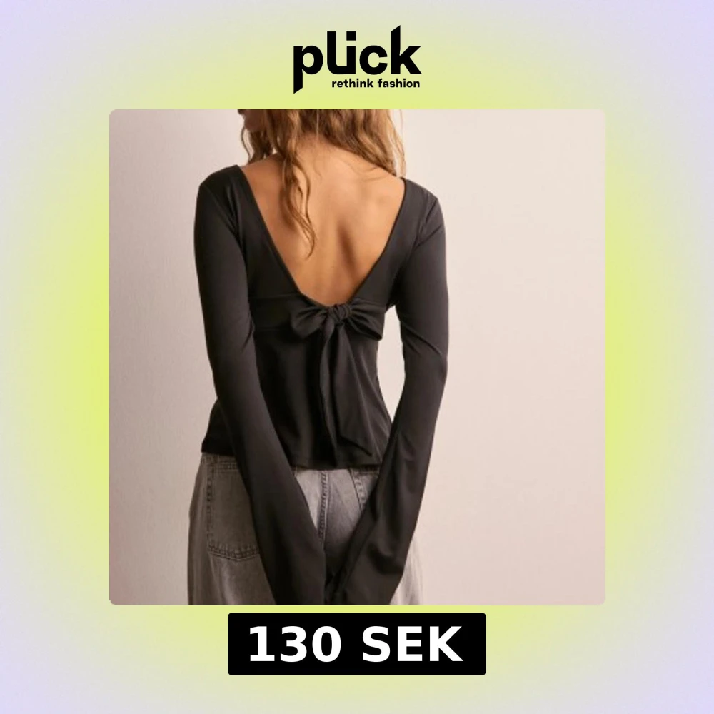 Snygg svart långärmad topp med djup v-ringning framtill och öppen rygg med en dekorativ rosett. Str S