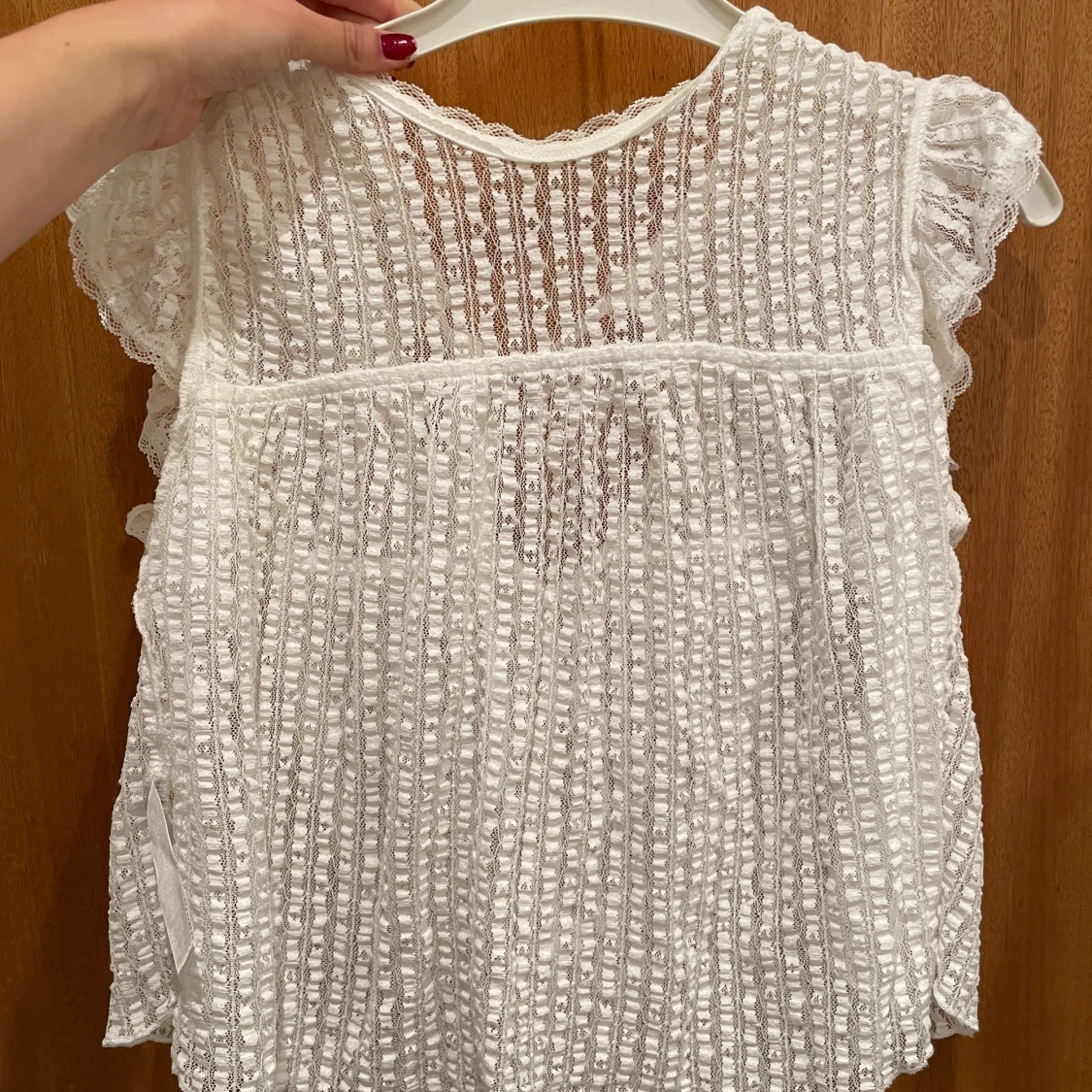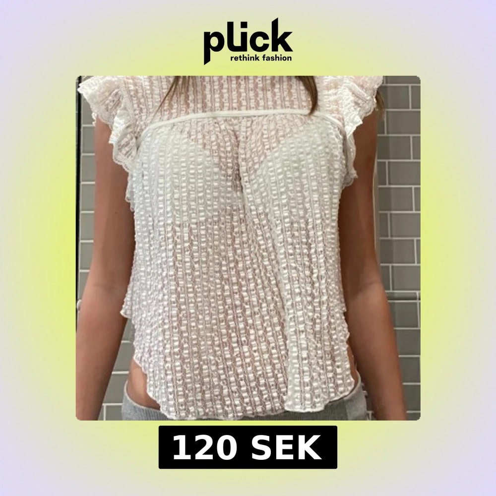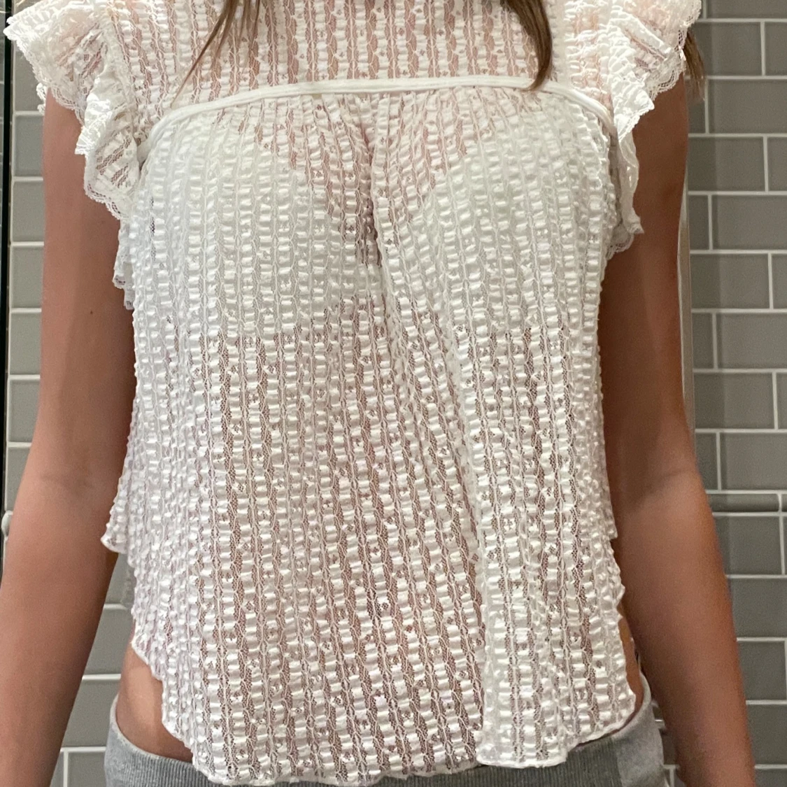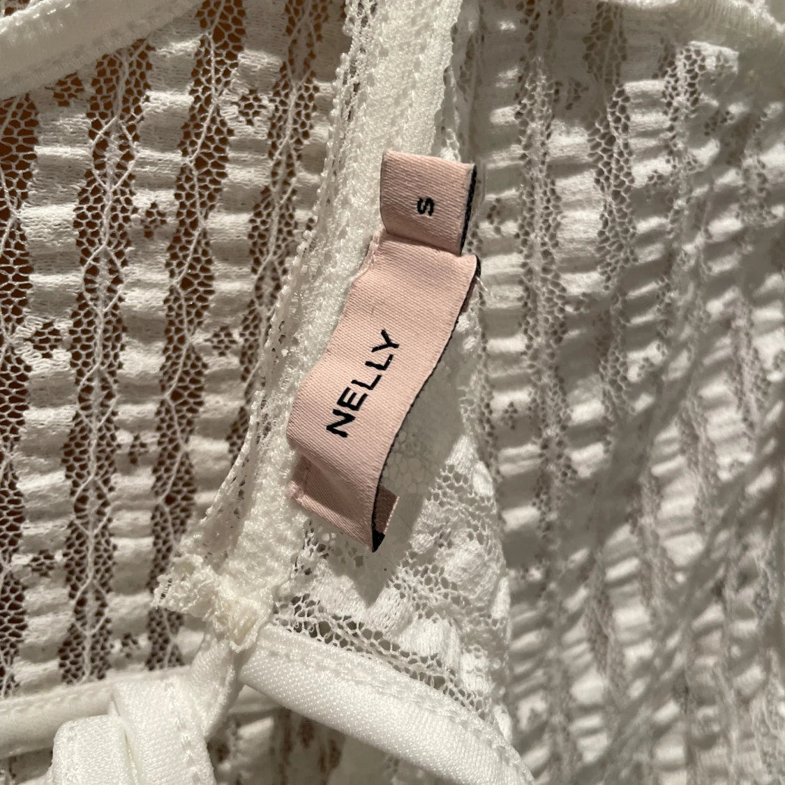 Säljer en vit blus från Nelly i storlek S. Blusen är genombruten med spets och har ett randigt mönster. Den har korta volangärmar och en croppad passform..