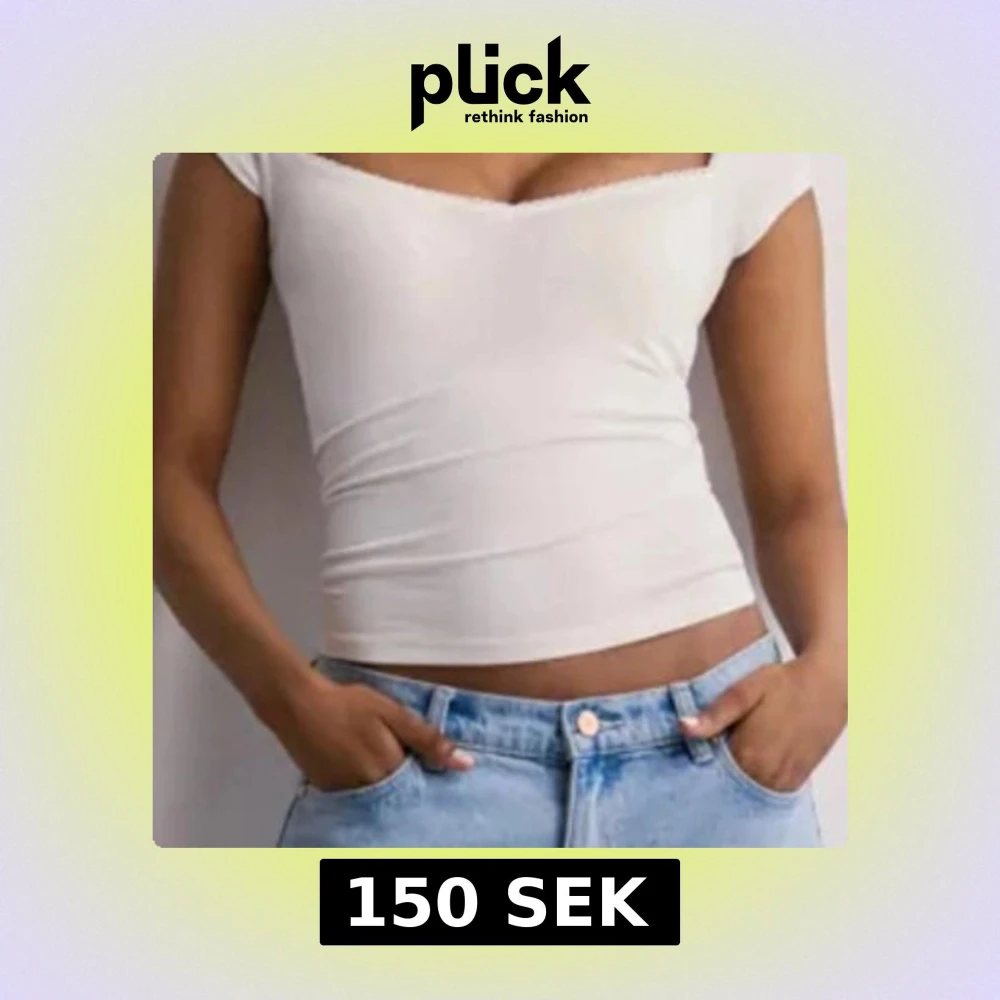 Säljer en vit croppad topp med v-ringning och korta ärmar. Toppen har en smickrande passform och en liten spetskant längs urringningen. Nypris 199kr, använd 1 gång