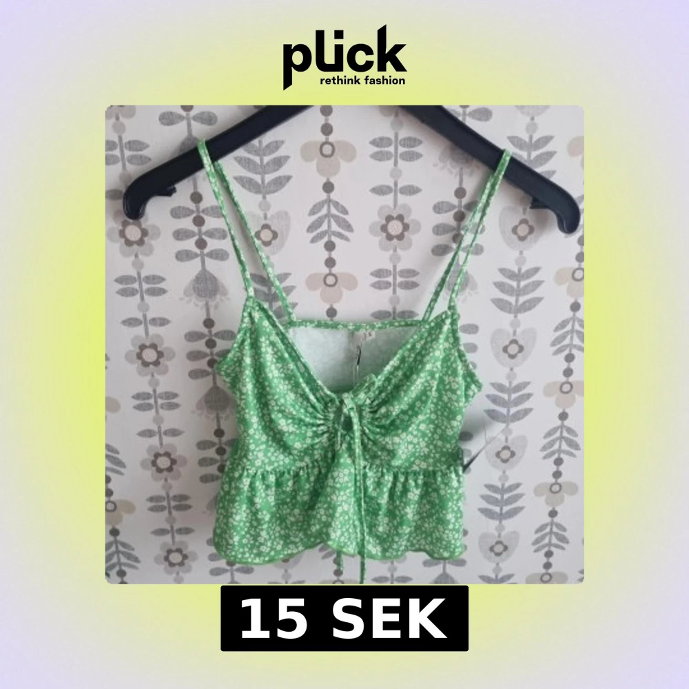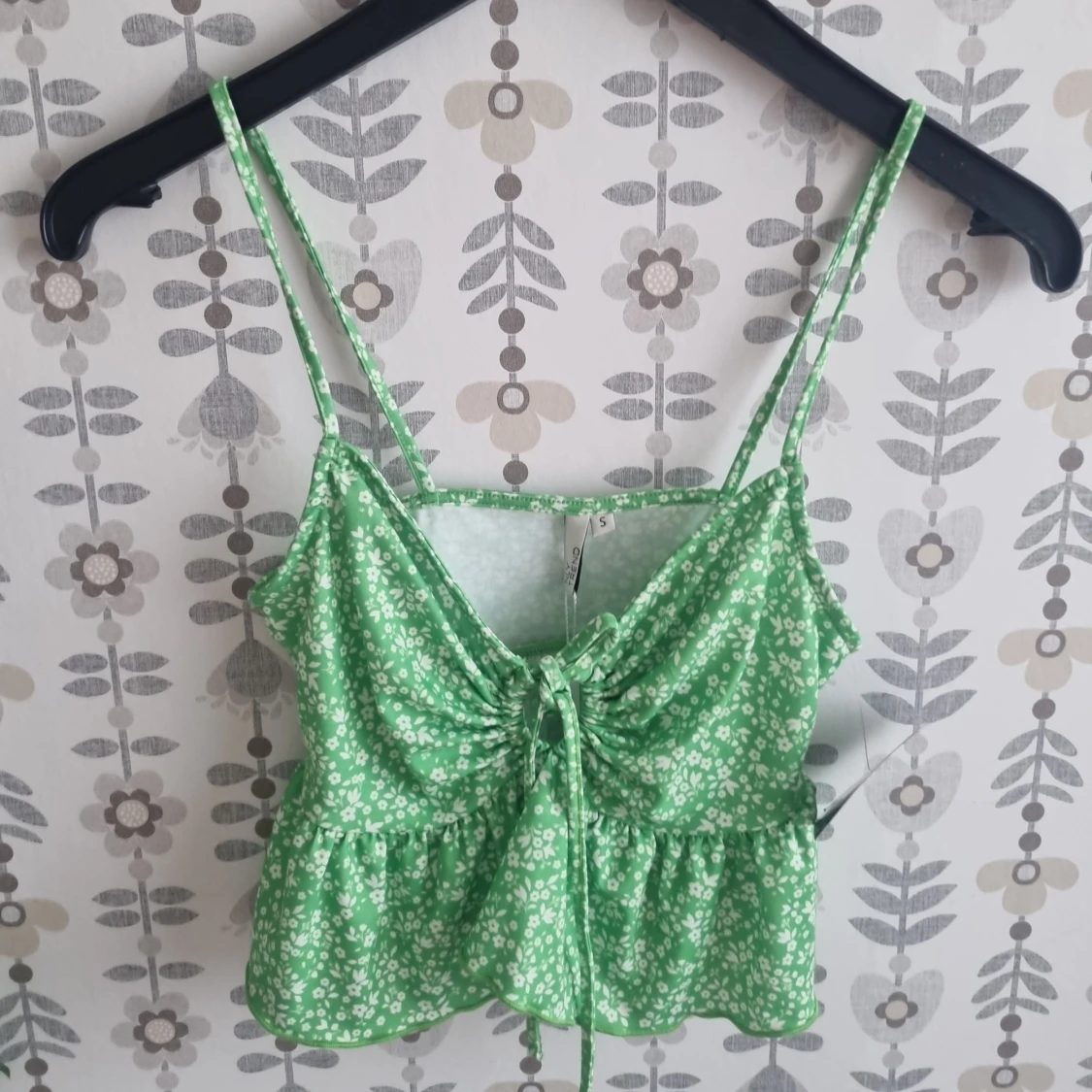 Söt grön linnetopp med vita små blommor och smala axelband. Toppen har en snygg snörning framtill som ger en cool rynkad effekt och en lätt volang nedtill. Perfekt för dig som gillar färg och mönster!