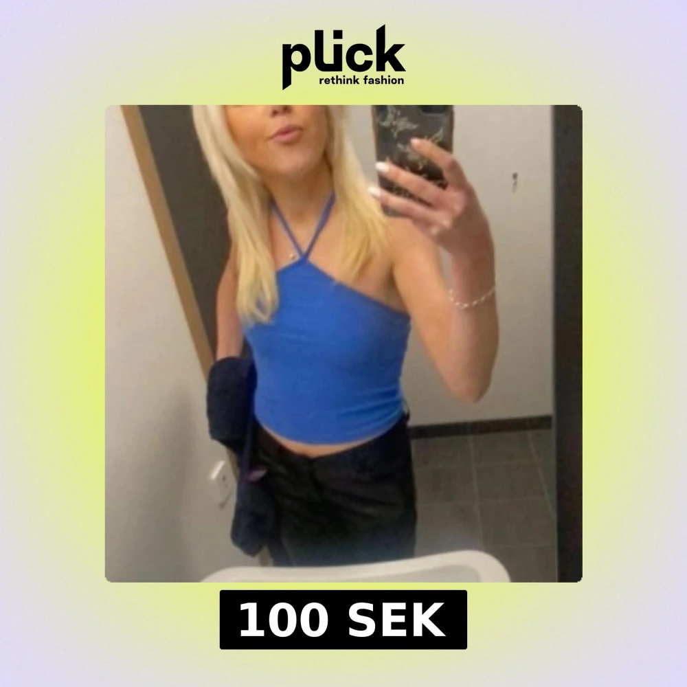 Säljer en blå croppad linnetopp med halterneck och smala axelband som korsas i nacken. Toppen är tight och har en enkel, stilren design. Från Nelly