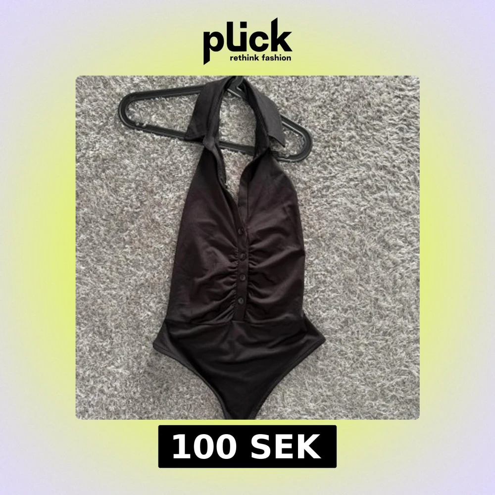 Snygg svart body med halterneck och knyt i nacken. Framsidan har dekorativa knappar och lätt rynkade detaljer som ger en cool look.