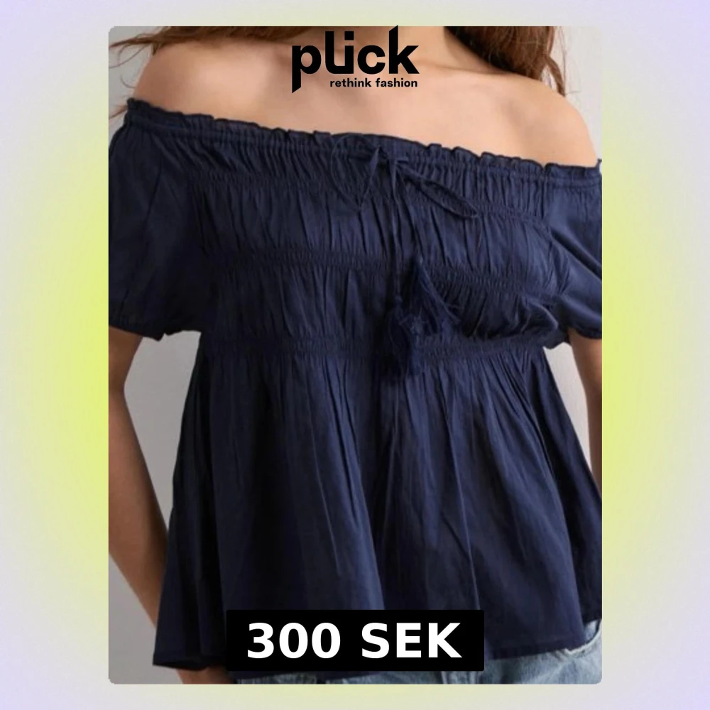 Trendig mörkblå offshoulder topp med korta ärmar och smockdetaljer upptill. Helt ny utan prislapp! Skriv för egna bilder!