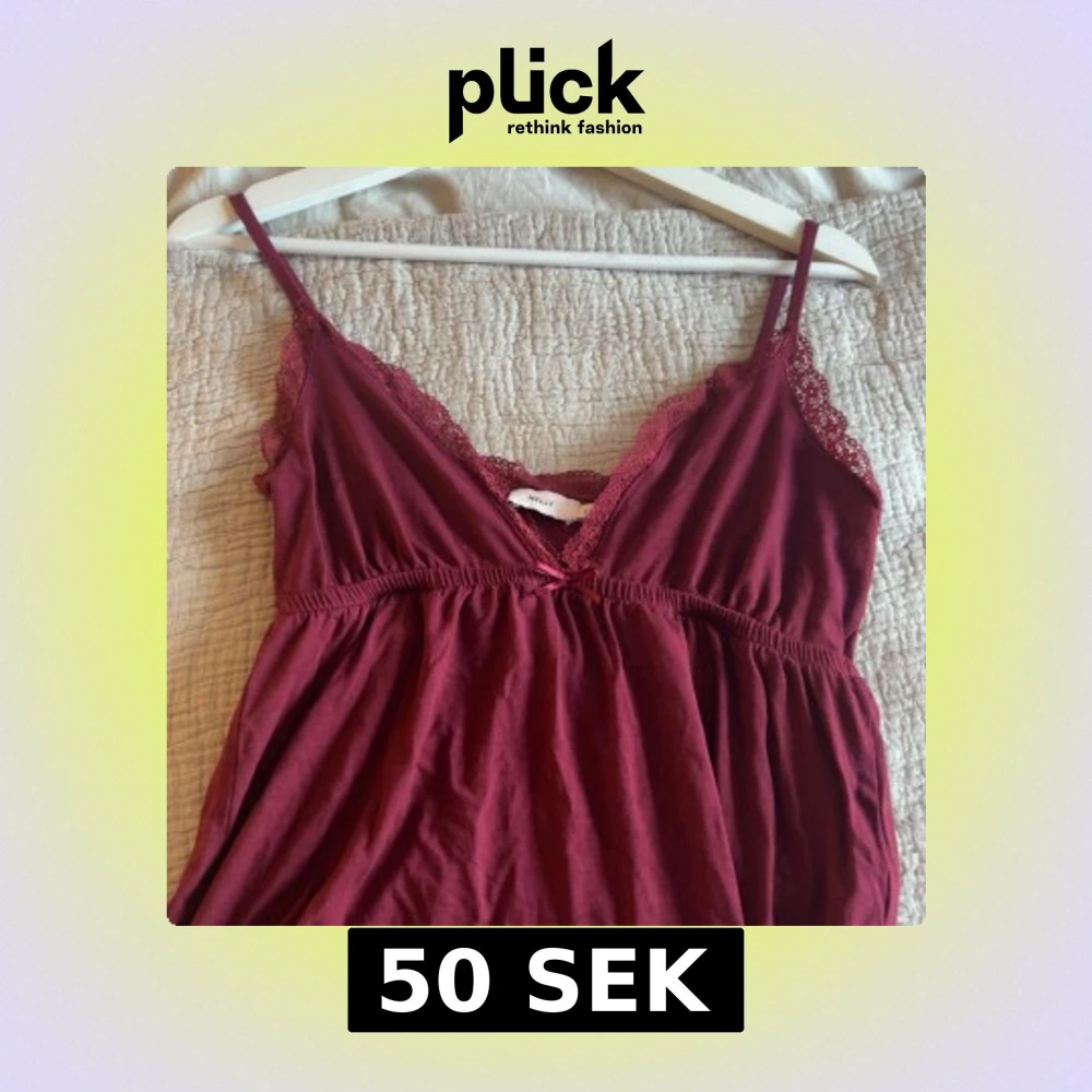 Vinröd topp från Nelly med smala axelband och v-ringning. Spetsdetaljer längs urringningen och en liten rosett framtill☺️