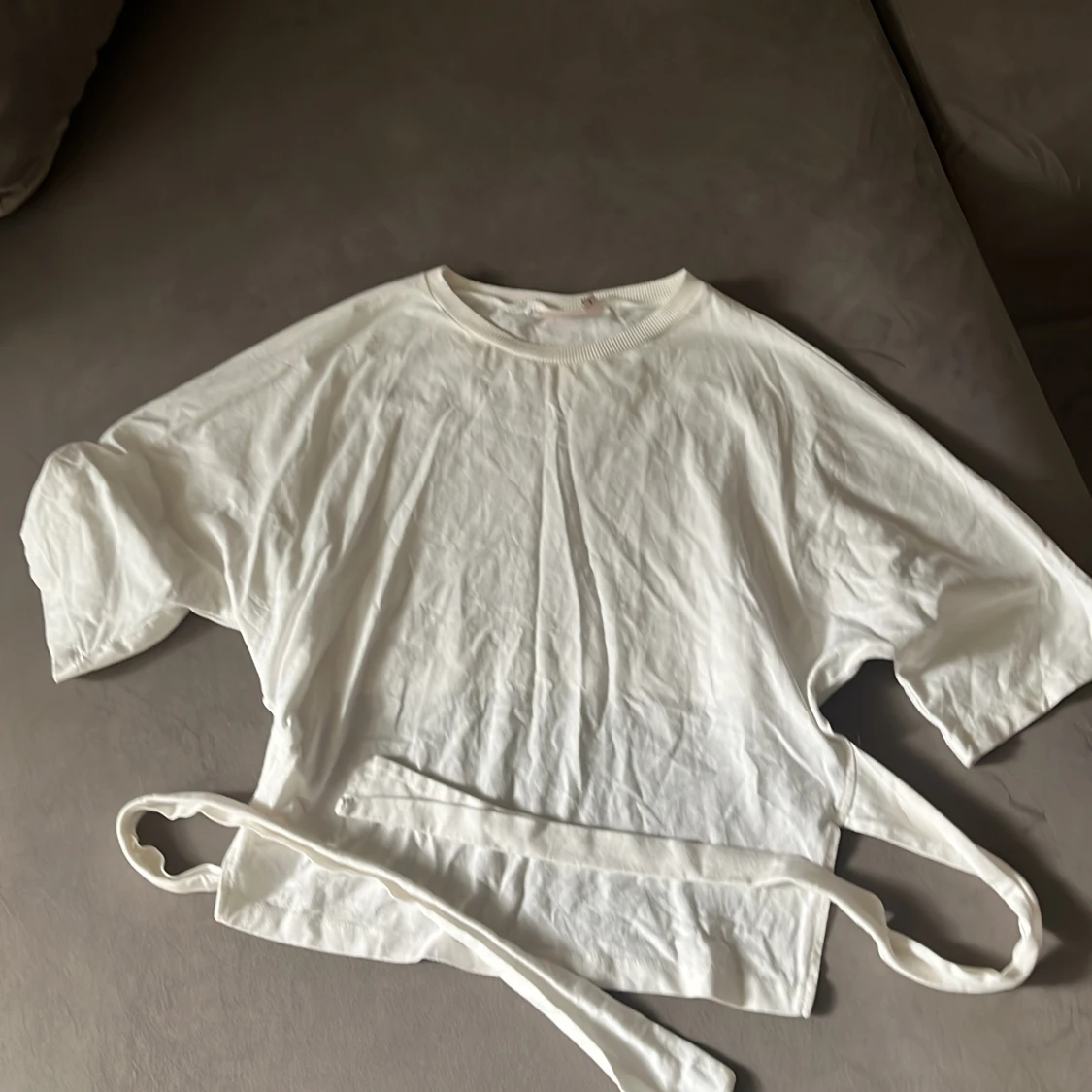 Vit omlottopp från Nelly i mjuk bomull. Modellen har korta ärmar, rund hals och långa knytband i midjan som ger en snygg siluett. Perfekt för dig som gillar minimalistisk stil med en twist. Passar dig som vill ha en enkel men trendig topp.