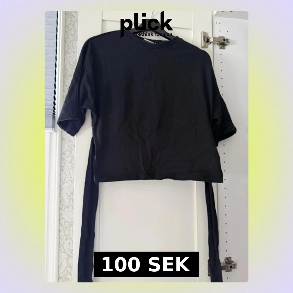 Säljer en svart croppad topp med långa knytband i midjan som kan knytas bak. Toppen har rund halsringning och korta ärmar. Perfekt för dig som gillar en enkel men trendig look.