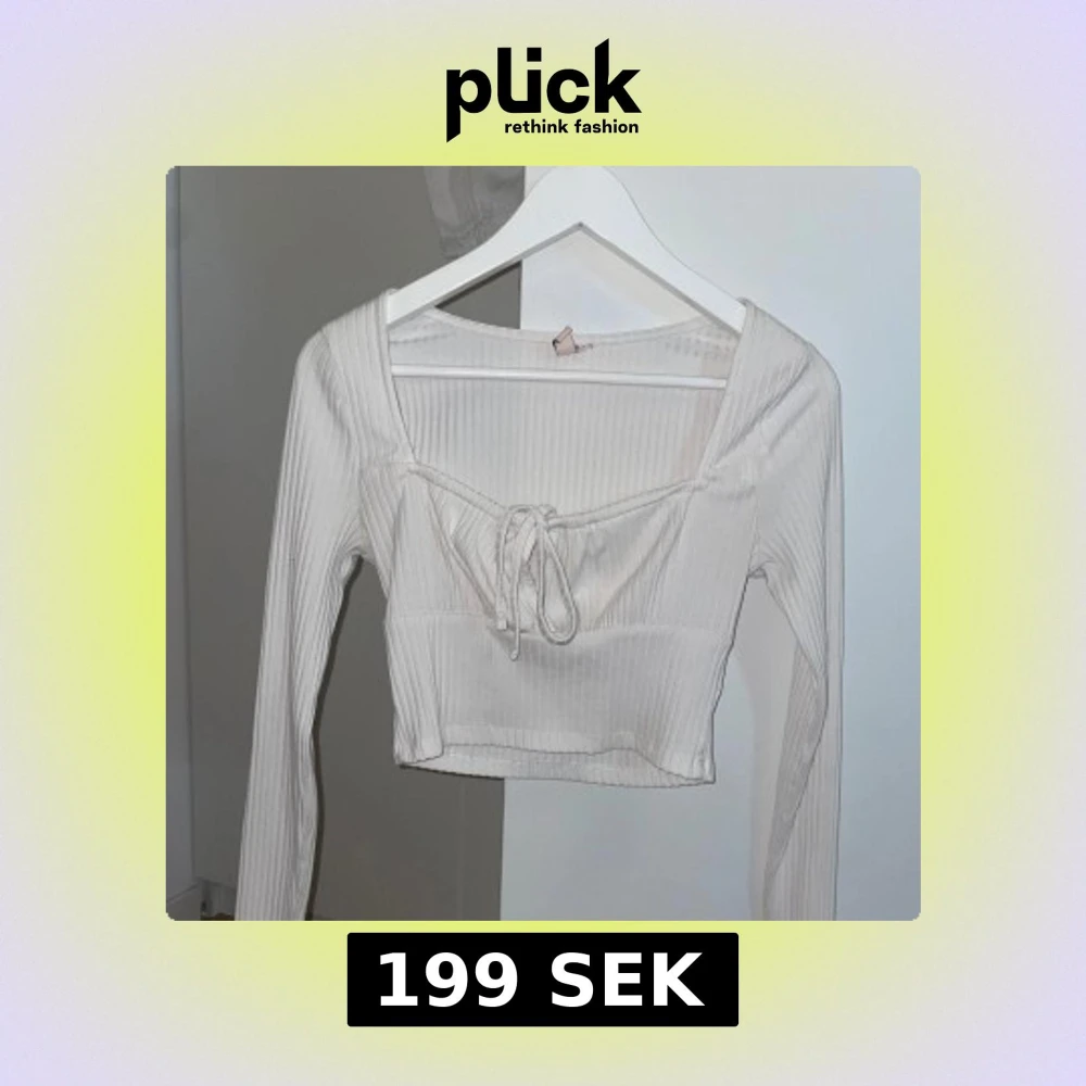 Säljer min vita croppade topp från Nelly med långa ärmar och fyrkantig ringning. Toppen är ribbad och har en söt knytning framtill som ger en extra detalj. Den är i storlek S och i mycket bra skick.