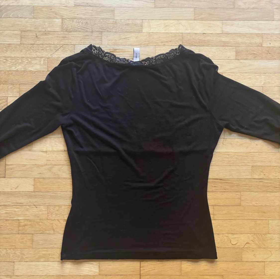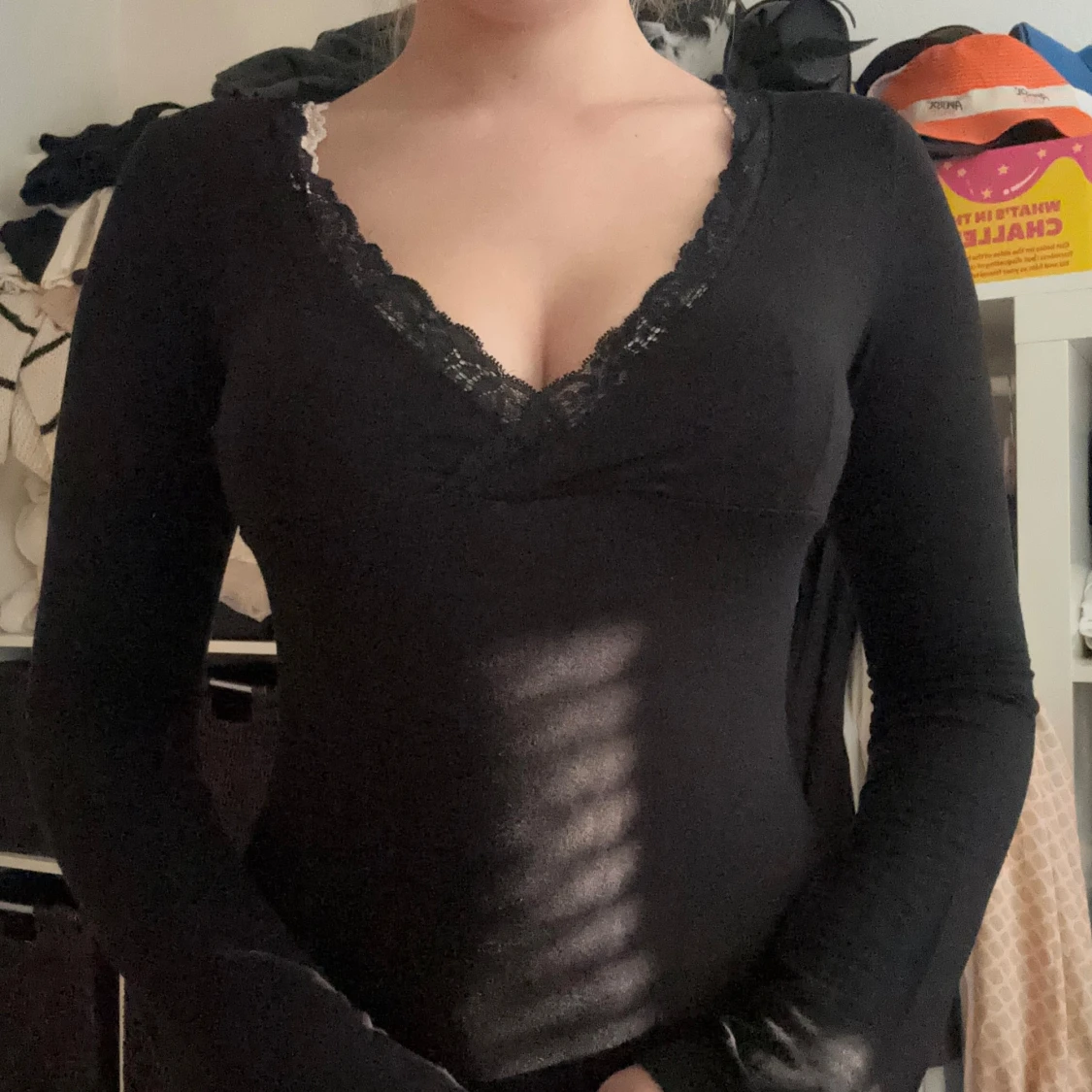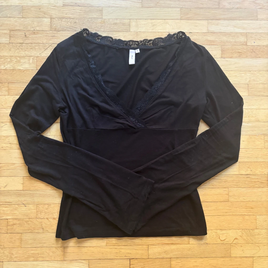 Svart långärmad topp från Nelly med djup v-ringning och spetskant runt halsen. Figurnära passform och mjukt bomullsmaterial som känns skönt mot huden. Perfekt för dig som gillar en enkel men ändå snygg look.