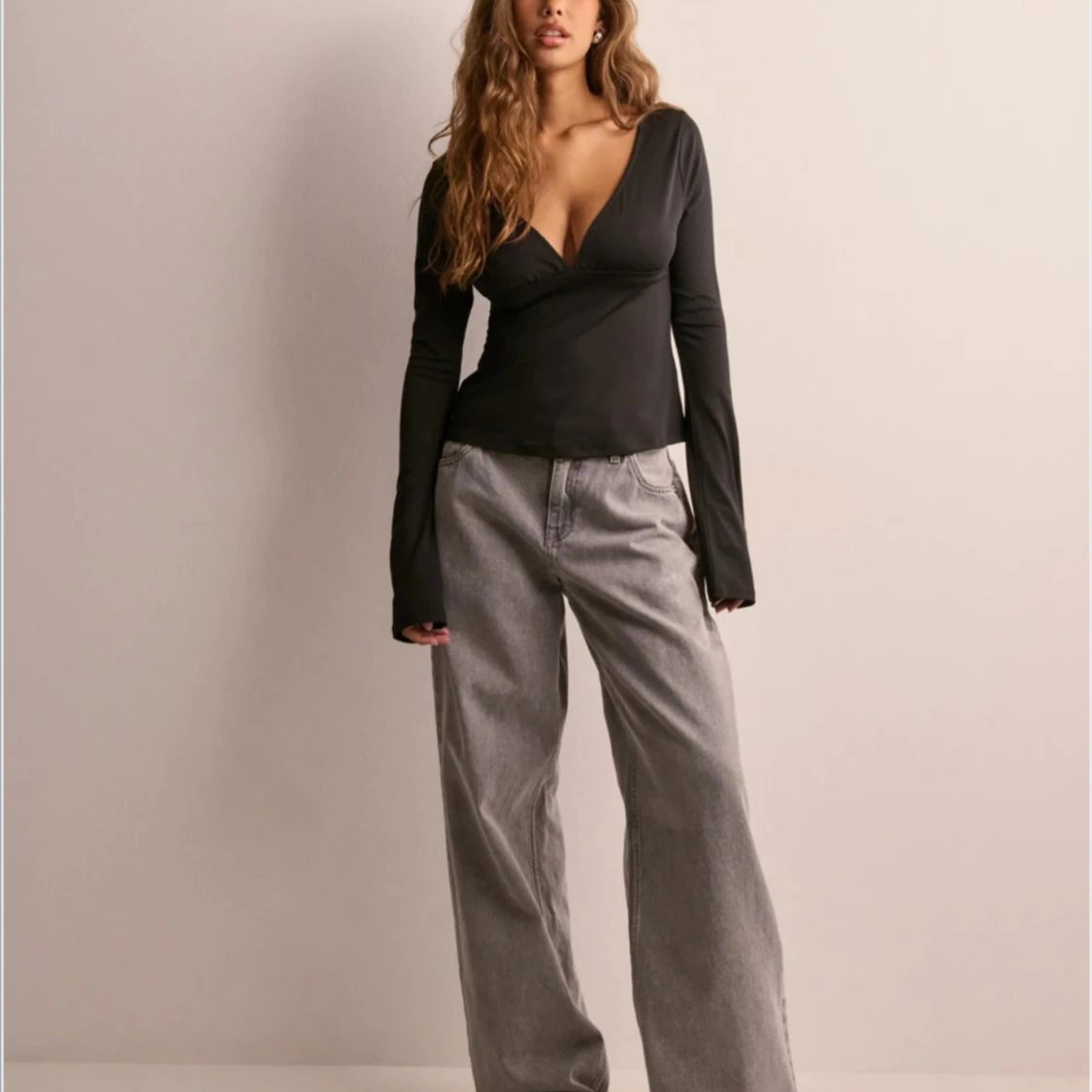 Super fin svart topp med djup v-ringning och lång ärm. Toppen har en öppen rygg med en tie back. Aldrig använd och etiketten är kvar😁