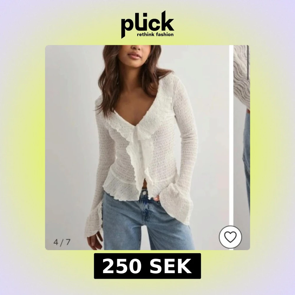 Supersöt vit blus med v-ringning och volangdetaljer längs fram och ärmslut. Tunn, lätt genomskinlig struktur med lång ärm och figurnära passform. Perfekt för dig som gillar romantiska vibes och vill sticka ut lite extra. Ordinarie pris 399kr aldrig använd bara provad!