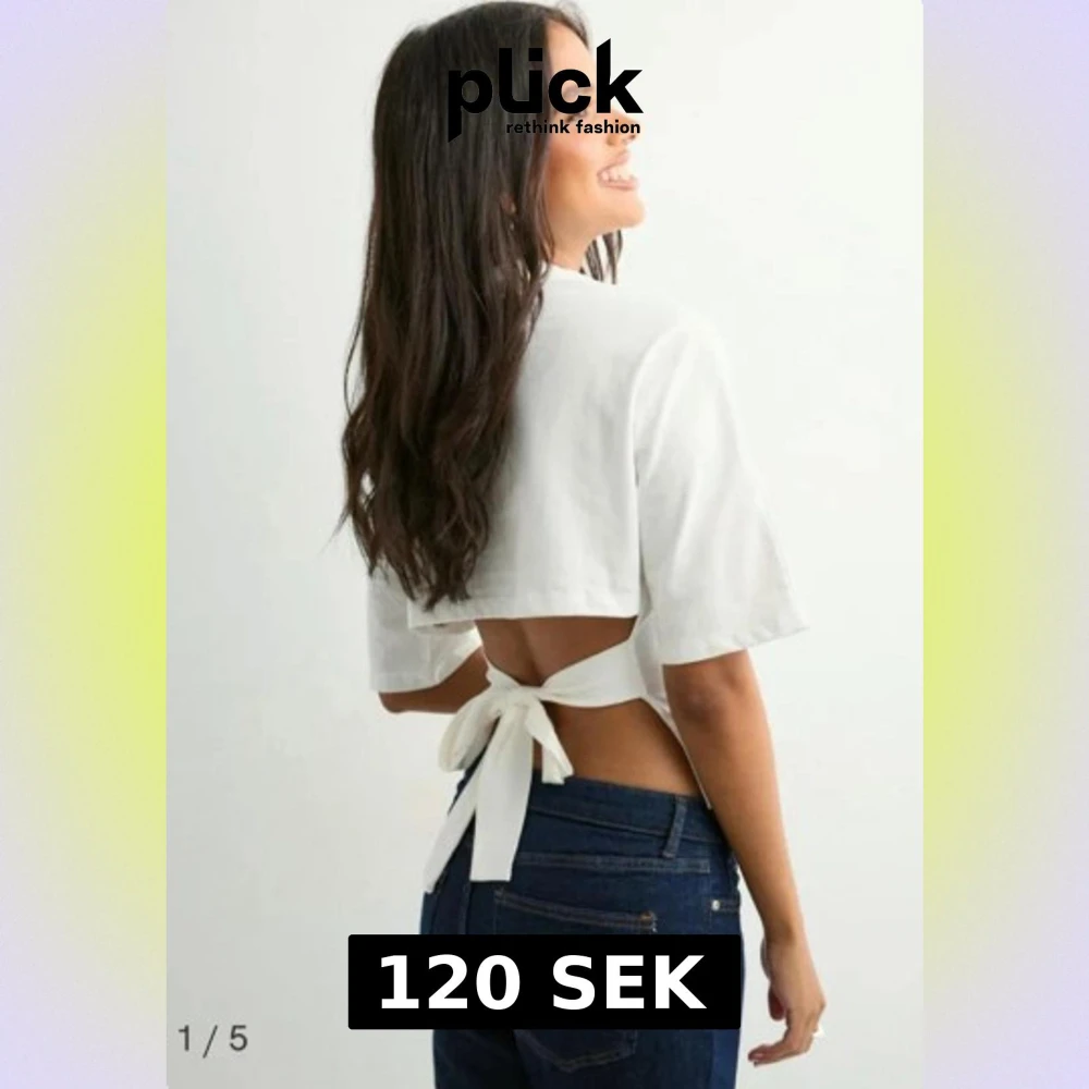 Säljer en vit croppad topp med korta ärmar och snygg knytning i ryggen. Toppen har en öppen rygg. Använd några gången, men har inga tecken på användning