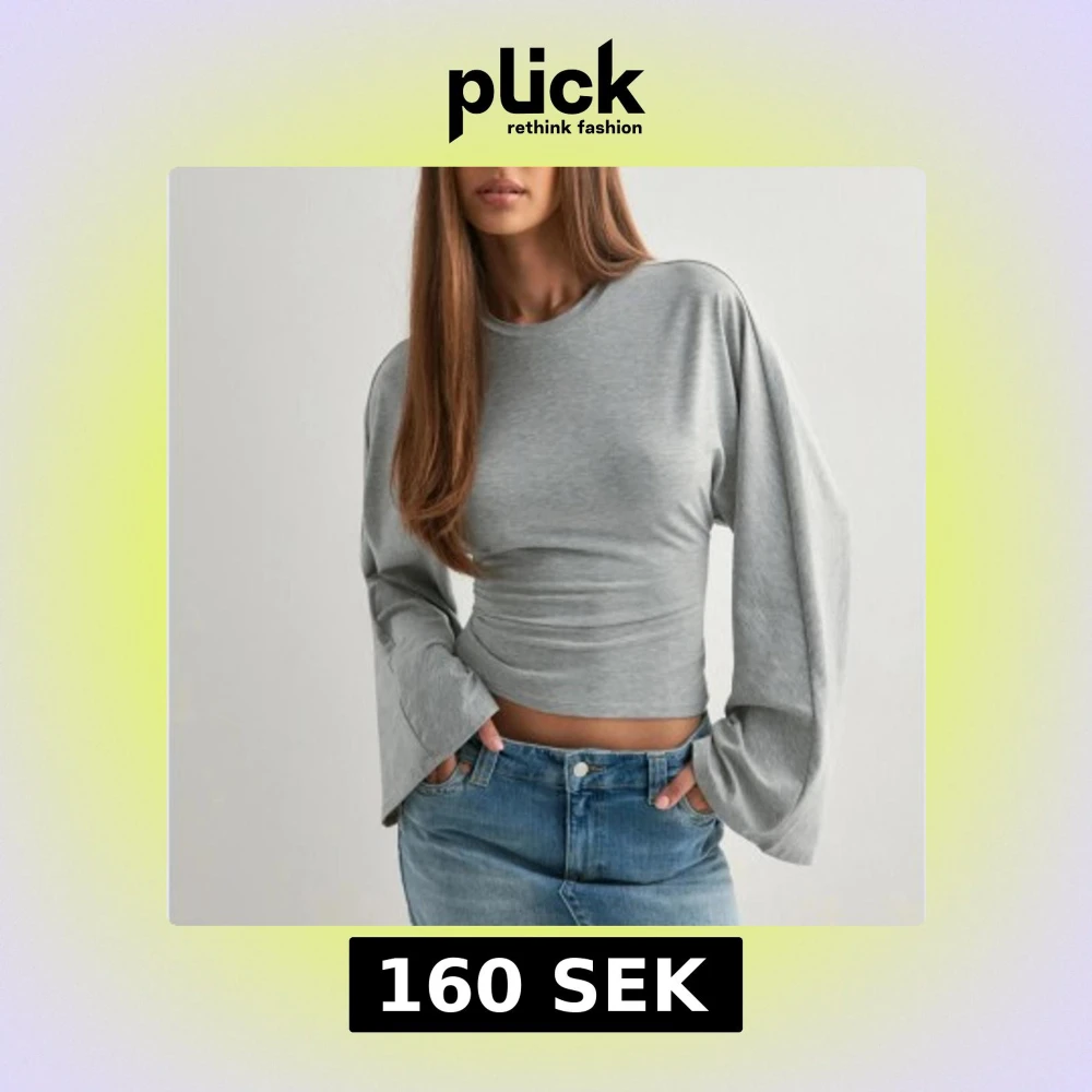Säljer en stilren grå croppad topp med långa, vida ärmar och rund halsringning. Toppen har en tight passform över midjan och är tillverkad i mjukt bomullsmaterial. Perfekt för dig som gillar en enkel men trendig look. Använd en gång och den är slutsåld på hemsidan